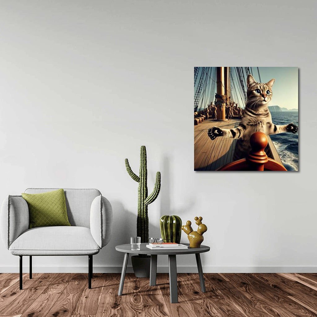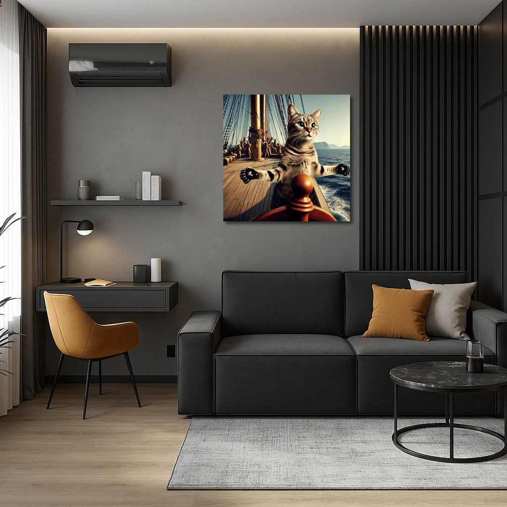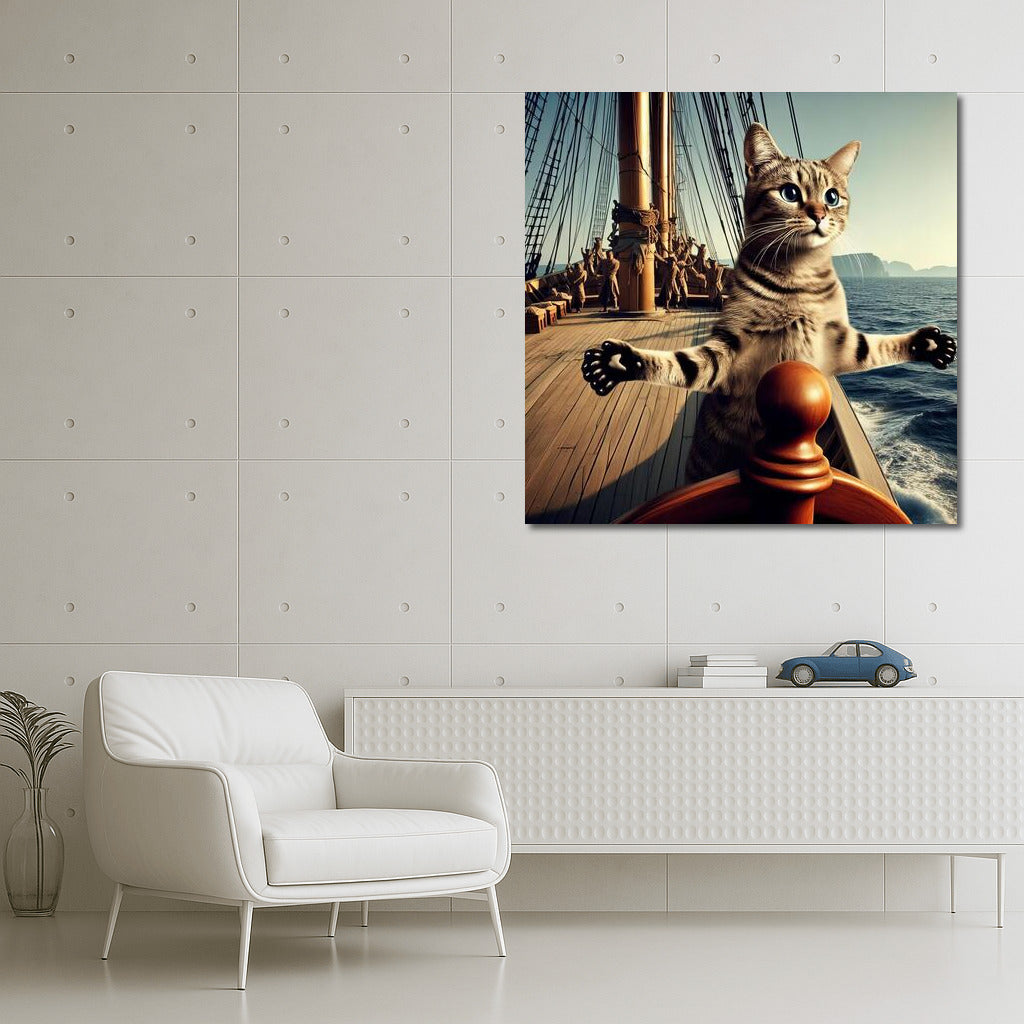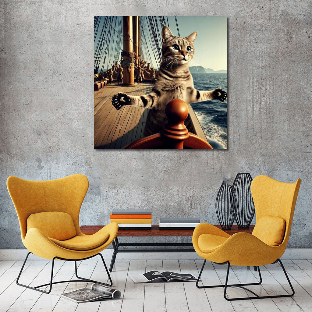 A poster with a cat on the bow of a ship in the style of Titanic. The cat with its paws spread out creates an atmosphere of freedom and adventure! See more from the collection: Animals Art