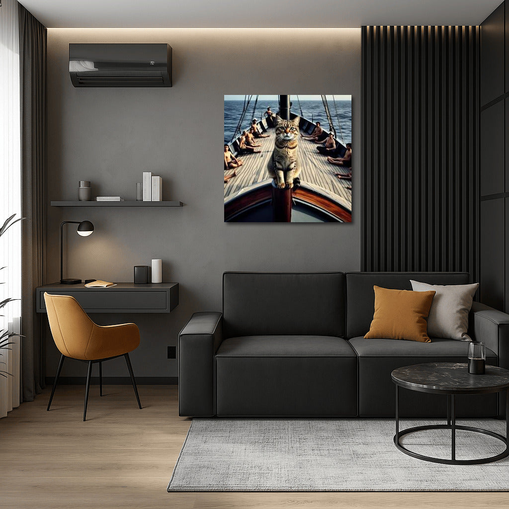 Poster: Titanic style cat on the bow of the ship, repeating the famous scene with its paws outstretched. Wall art. See more from the collection: Animals Art