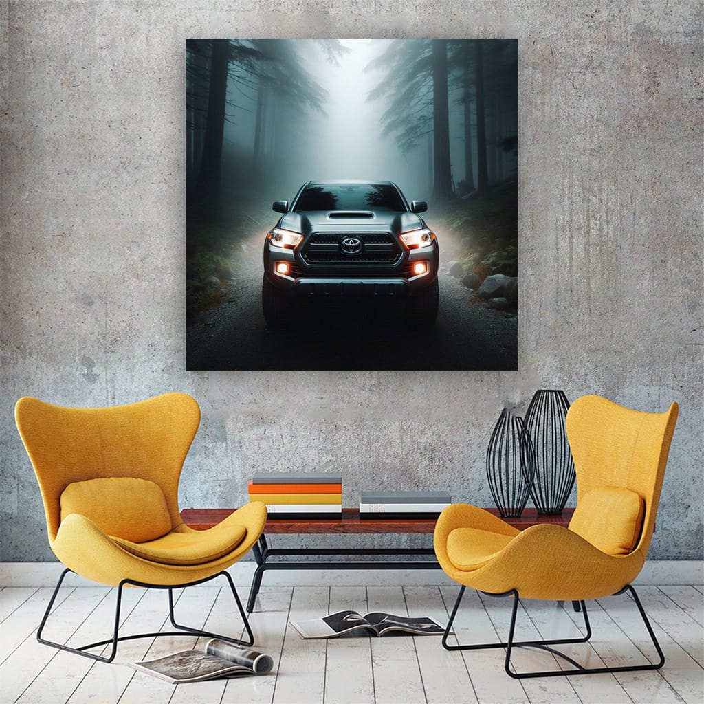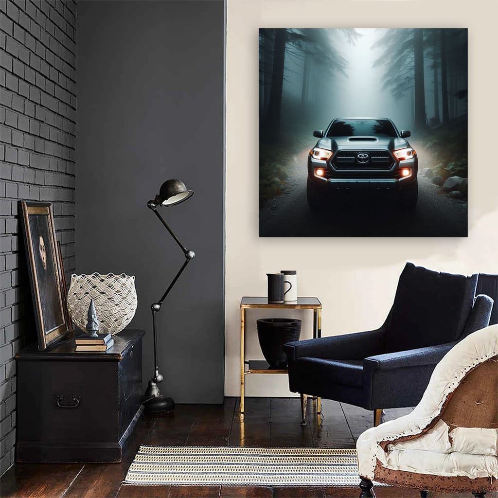 This painting is a blast for the guys who love Toyota Tacoma. The poster on the wall in the garage with its bright headlights in the fog is a symbol of the daring spirit of off-roading. Wall art for those who live life to the fullest. See more from the collection: Toyota Art