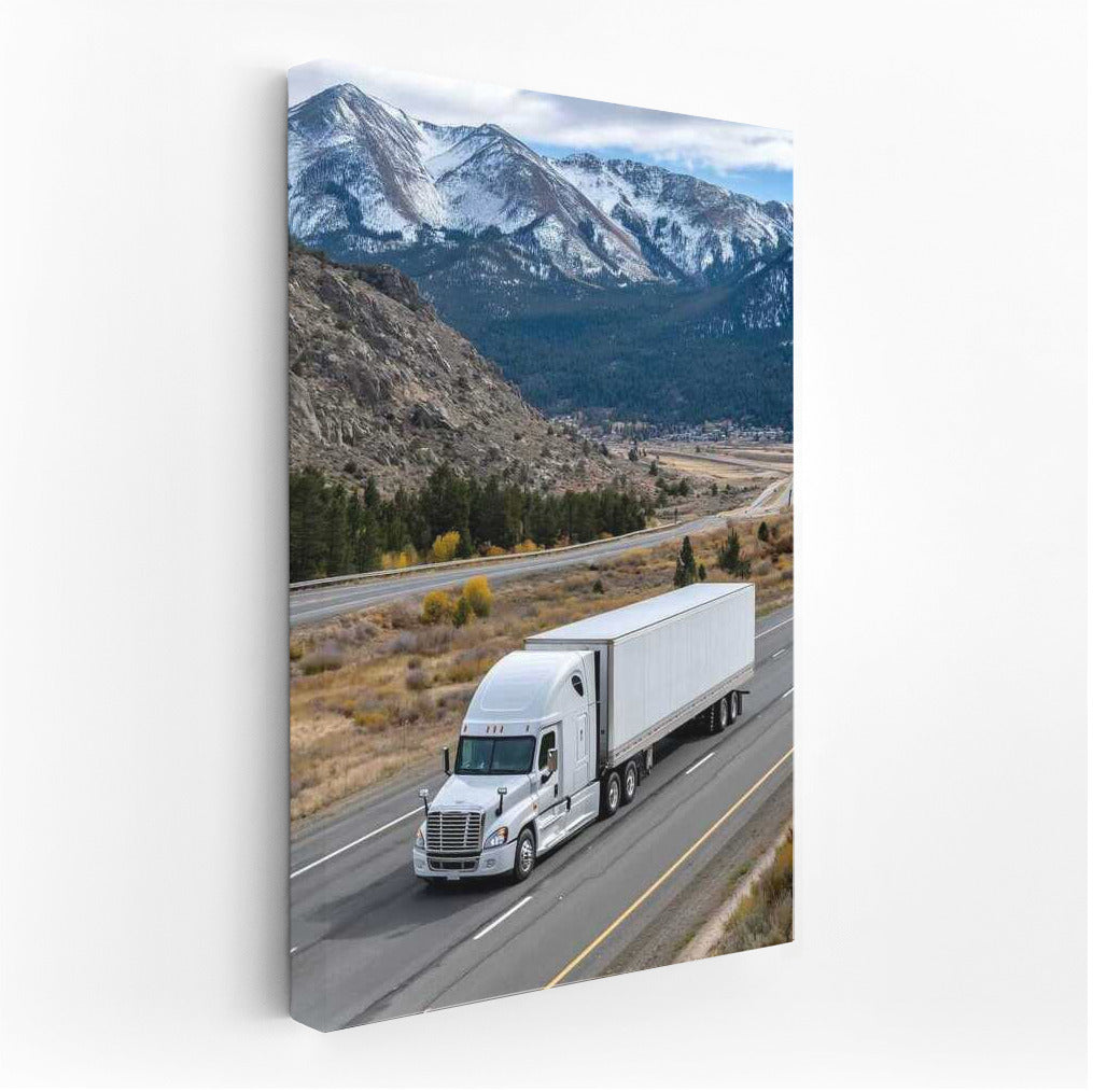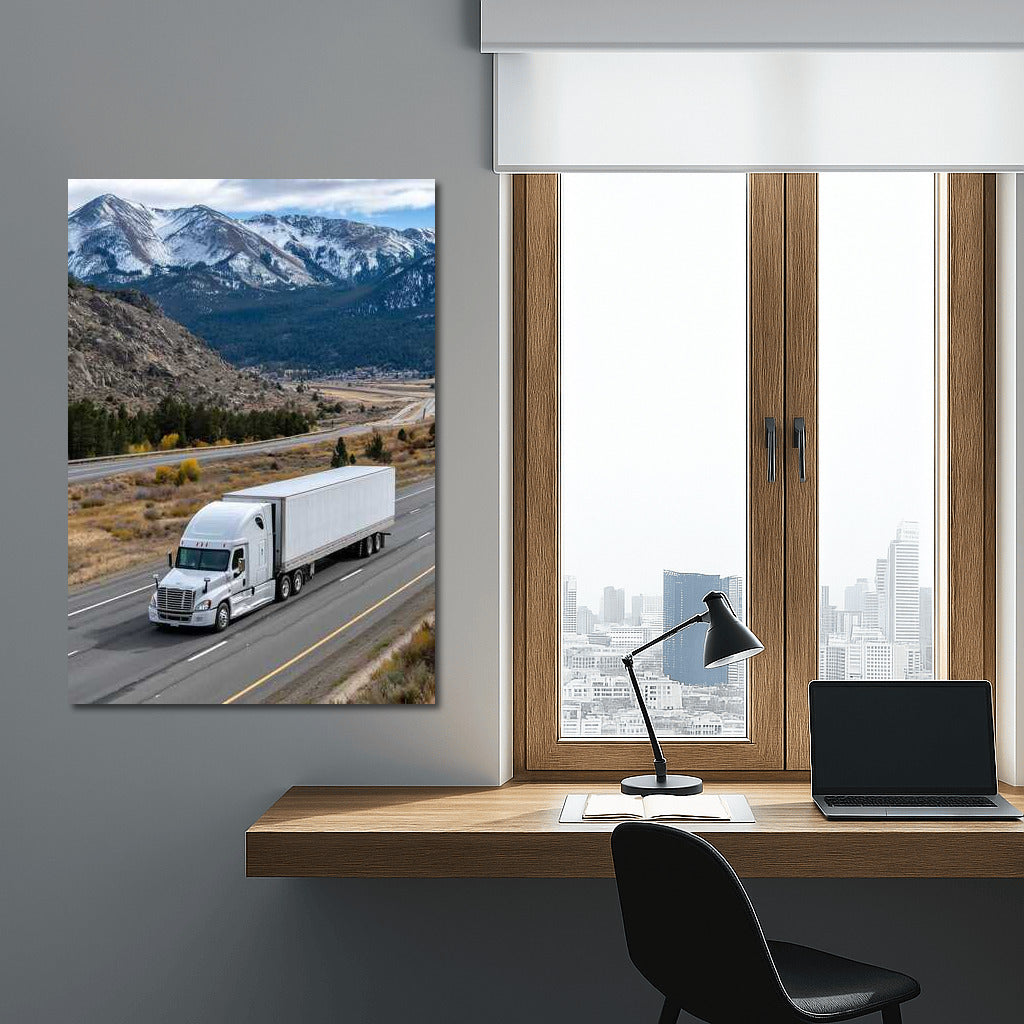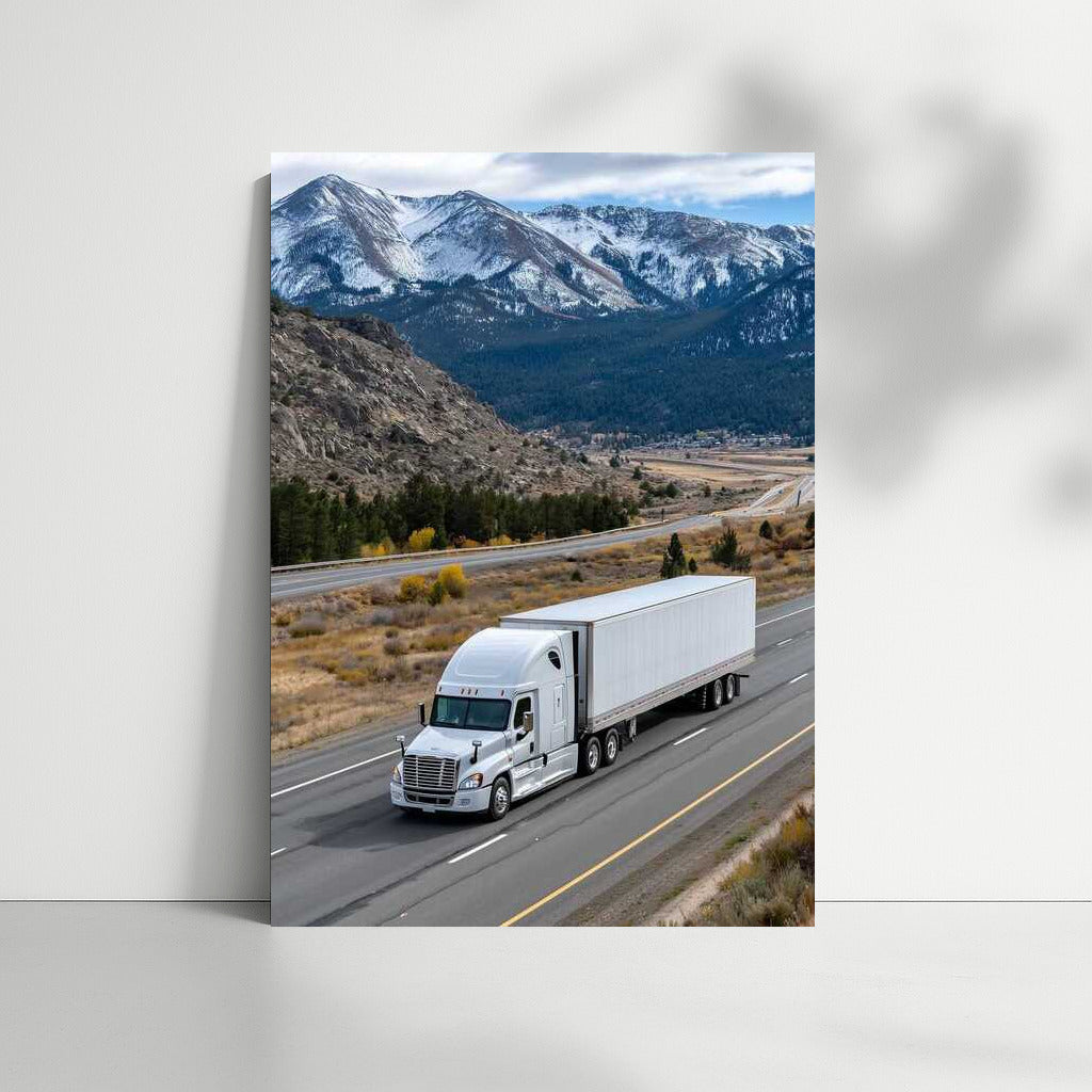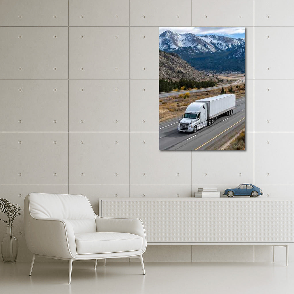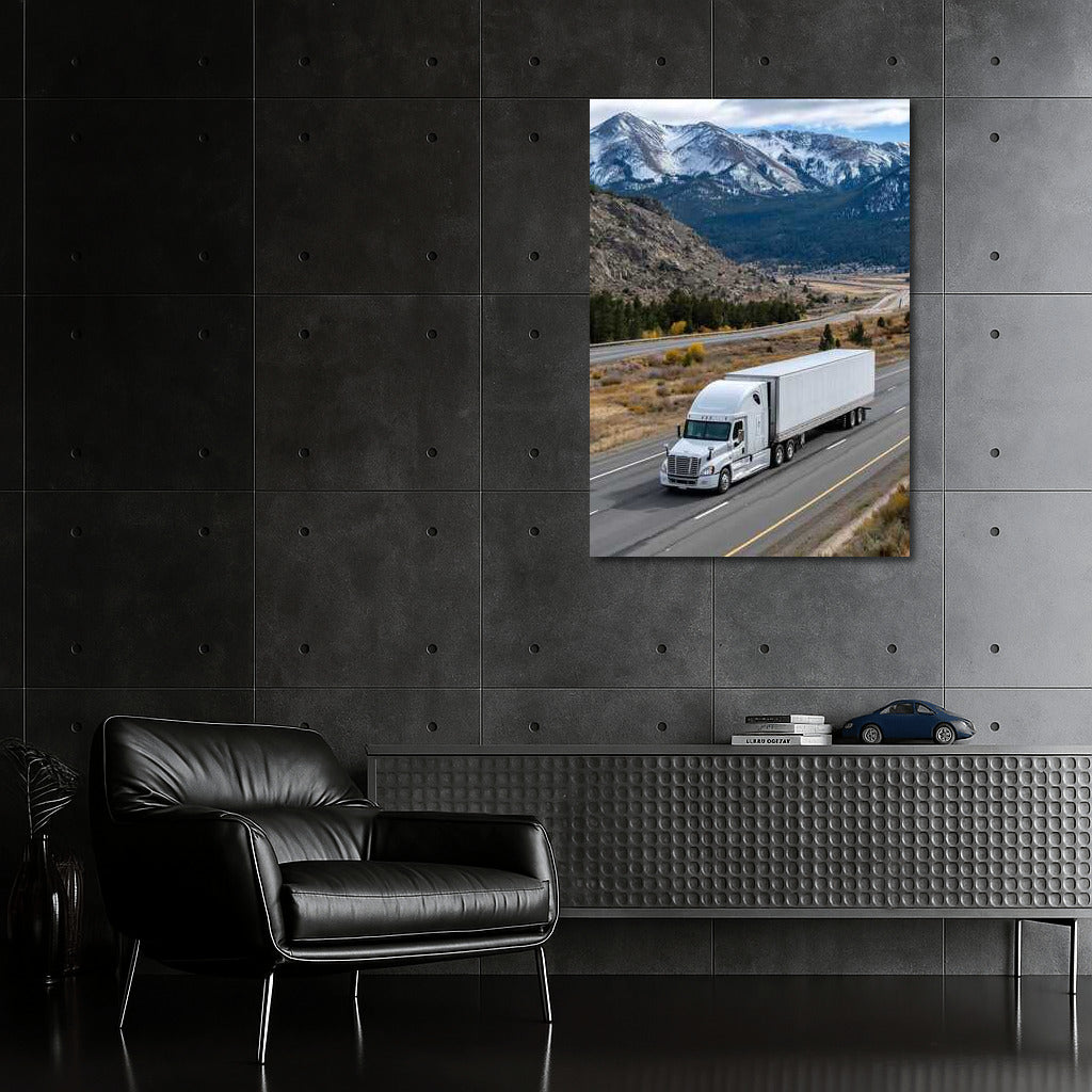 A powerful tractor crosses paintingsque mountains. A perfect poster for lovers of transport and the freedom of the road. Wall art. See more from the collection: Transport Art