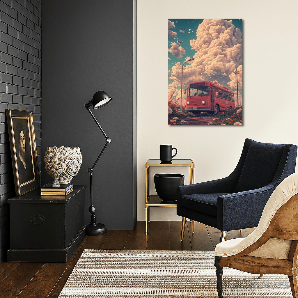 Retro bus with majestic clouds and wild nature in the background. This poster will add an adventurous atmosphere to your wall art. See more from the collection: Anime & Manga genres Art