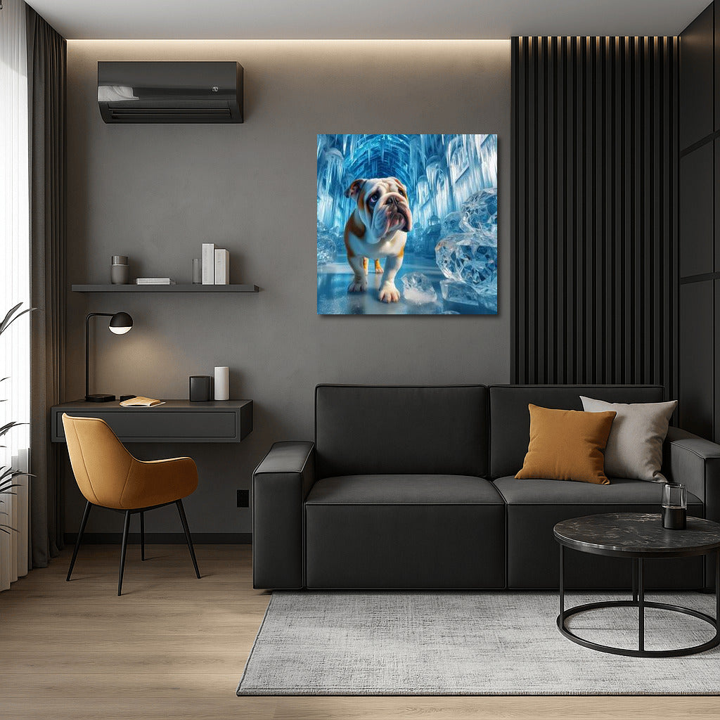 The English Bulldog on the poster explores an ice palace where every step he takes turns the ice into gems. Wall art. See more from the collection: Animals Art
