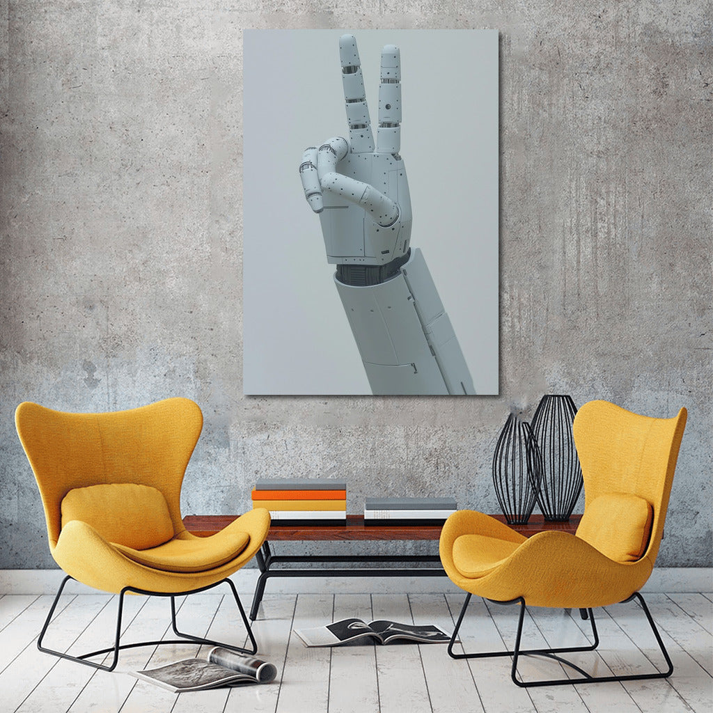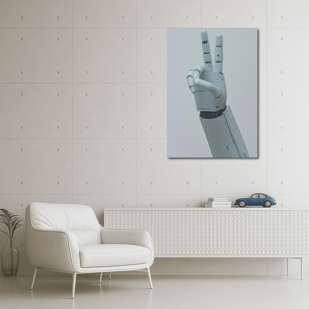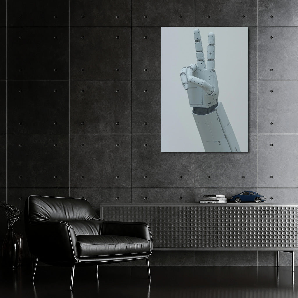 Robotic hand in victory gesture. This poster will add a futuristic atmosphere to your space. Wall art of the future! See more from the collection: Mixed Wall Art