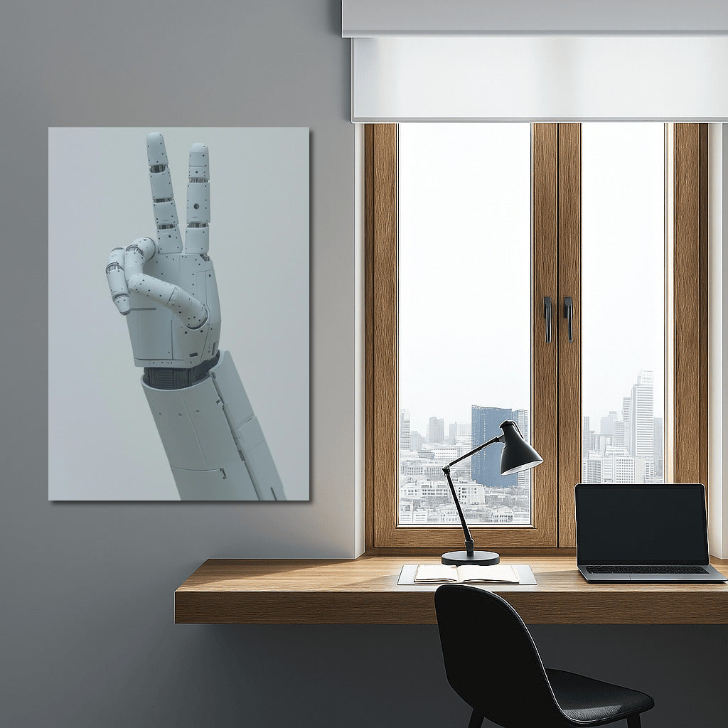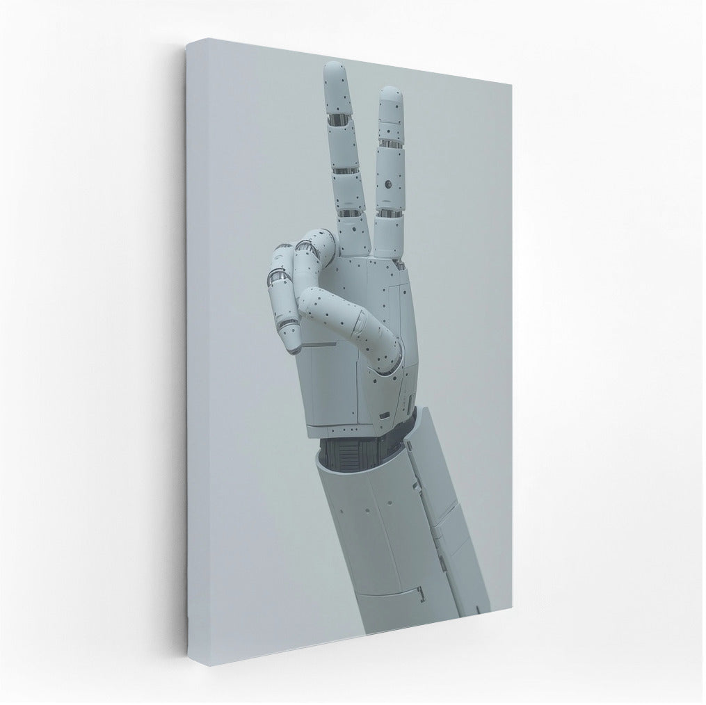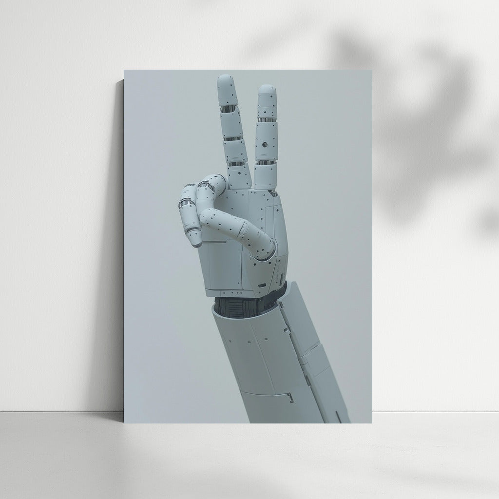 Robotic hand in victory gesture. This poster will add a futuristic atmosphere to your space. Wall art of the future! See more from the collection: Mixed Wall Art