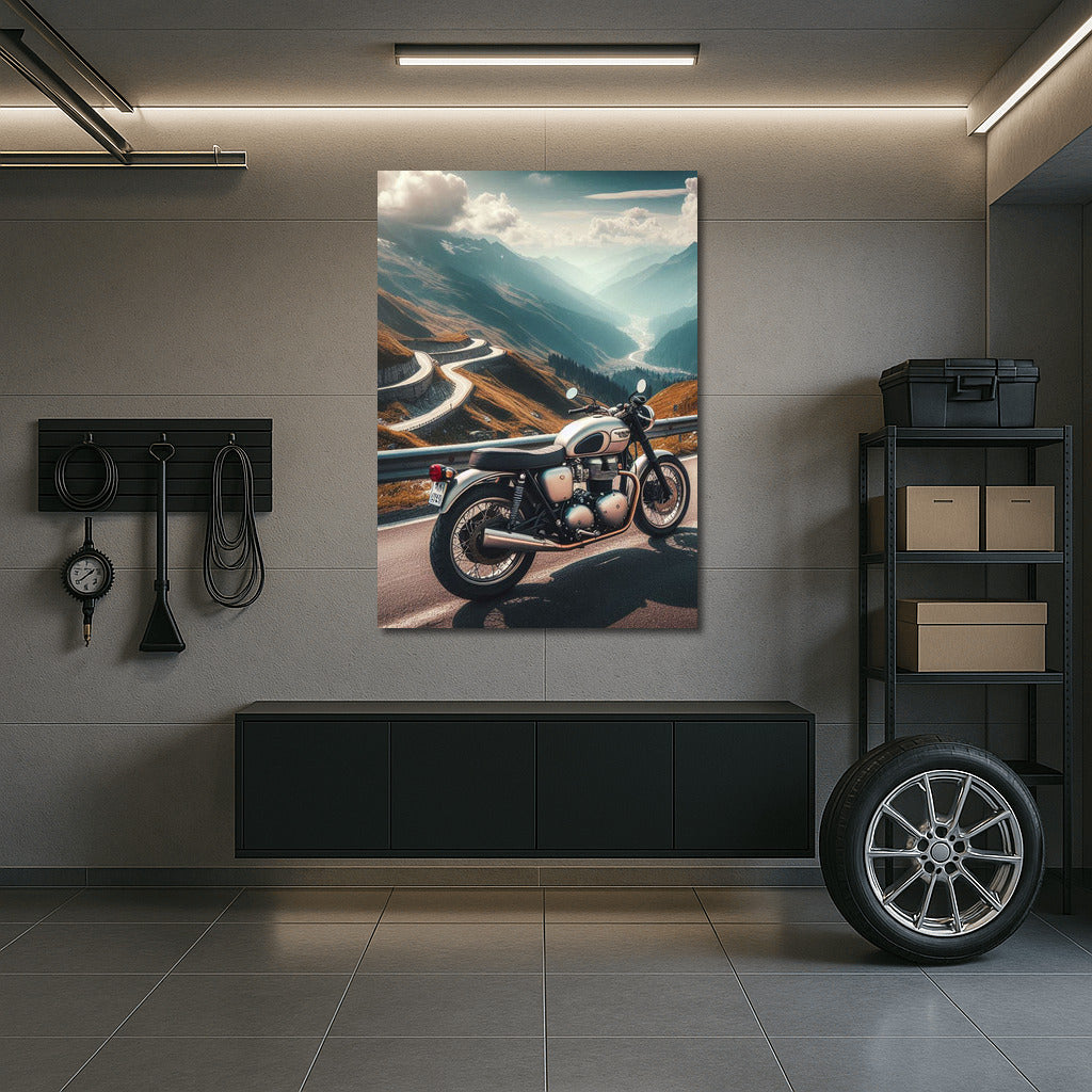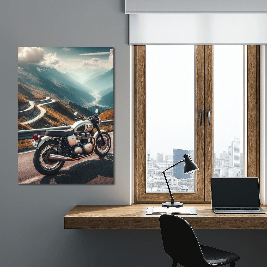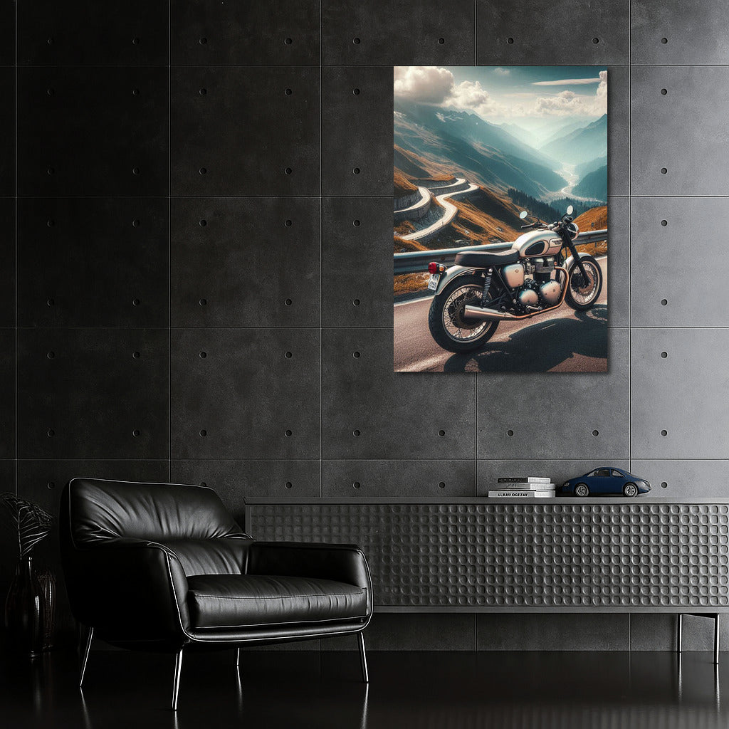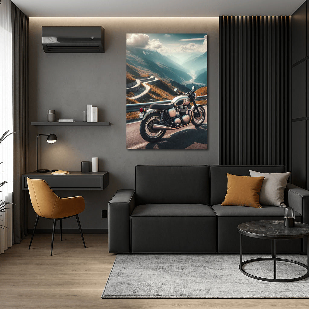 Triumph motorcycle on a winding mountain road. The spirit of freedom on your wall - the perfect poster for any traveler! See more from the collection: Motorcycles Art