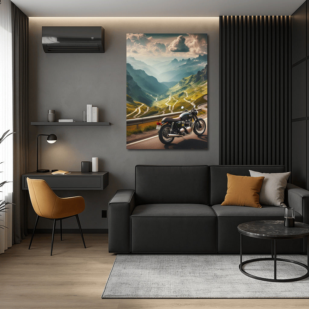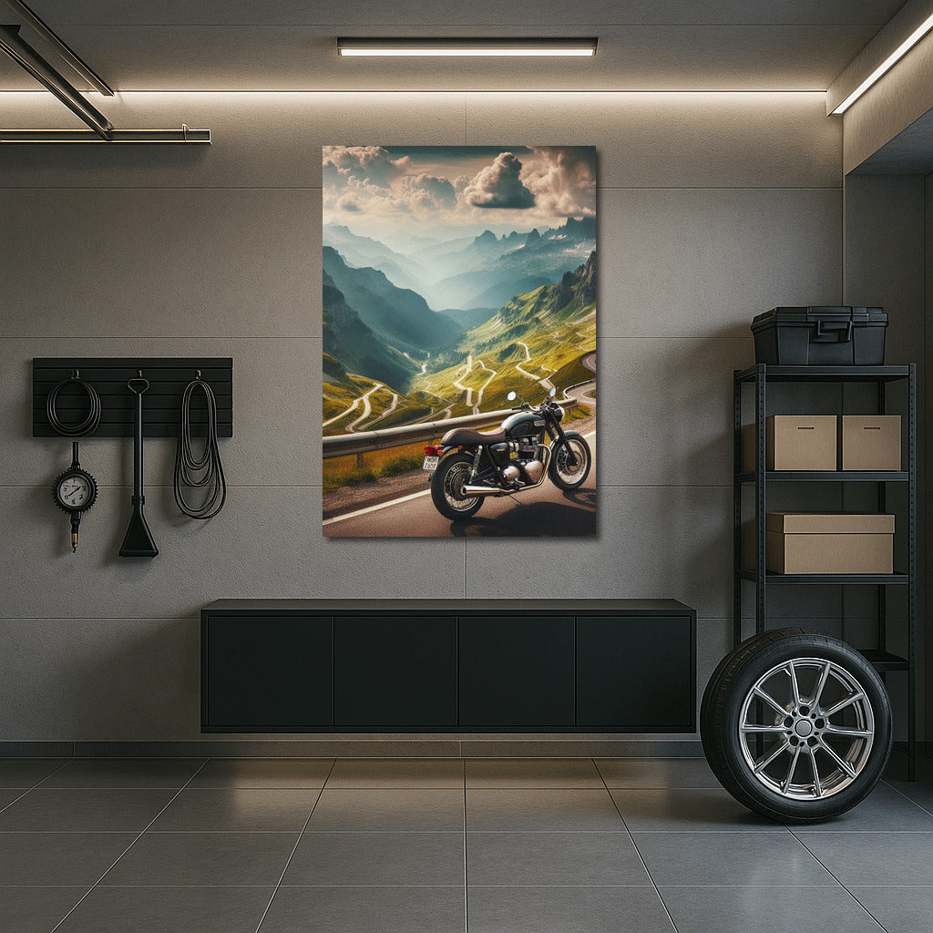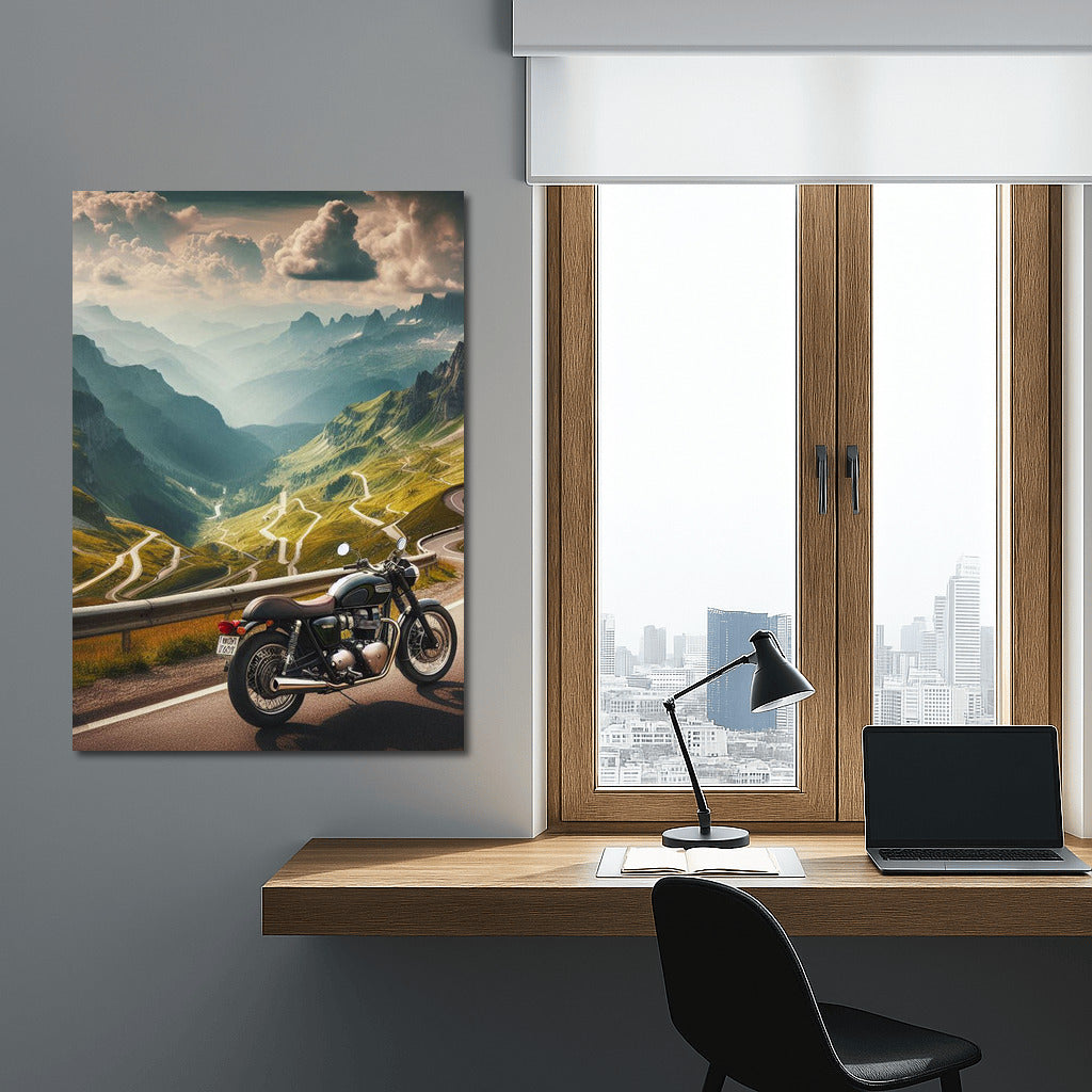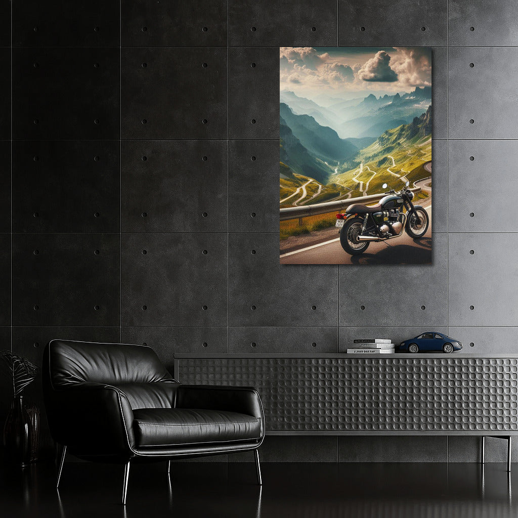 Triumph motorcycle poster on a winding mountain road. Wall art for lovers of fast-paced adventures! See more from the collection: Motorcycles Art