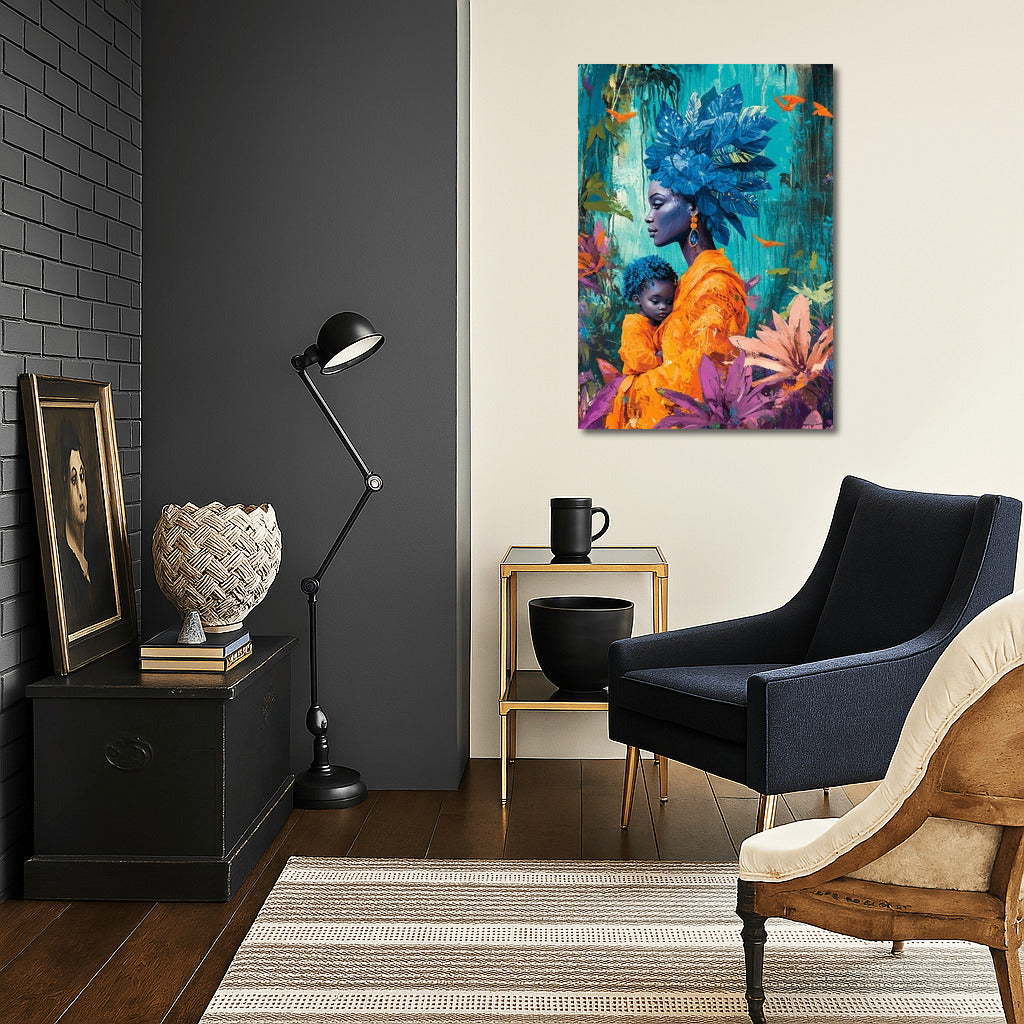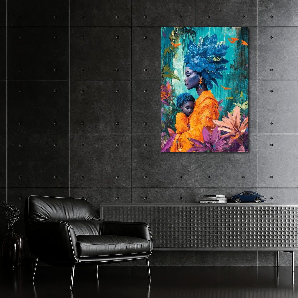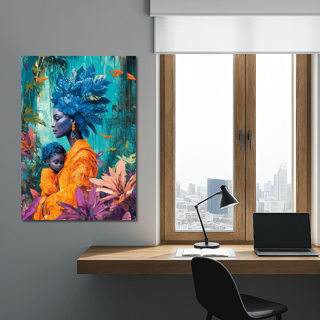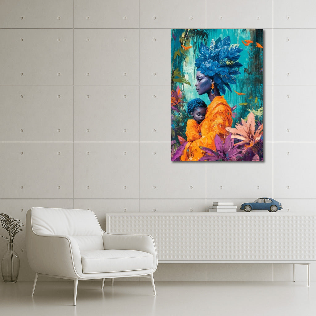 A bright and emotional poster: a woman with a child surrounded by rich colors and tropics. Wall art that fills the soul with warmth. See more from the collection: Mixed Wall Art