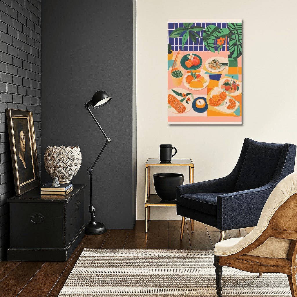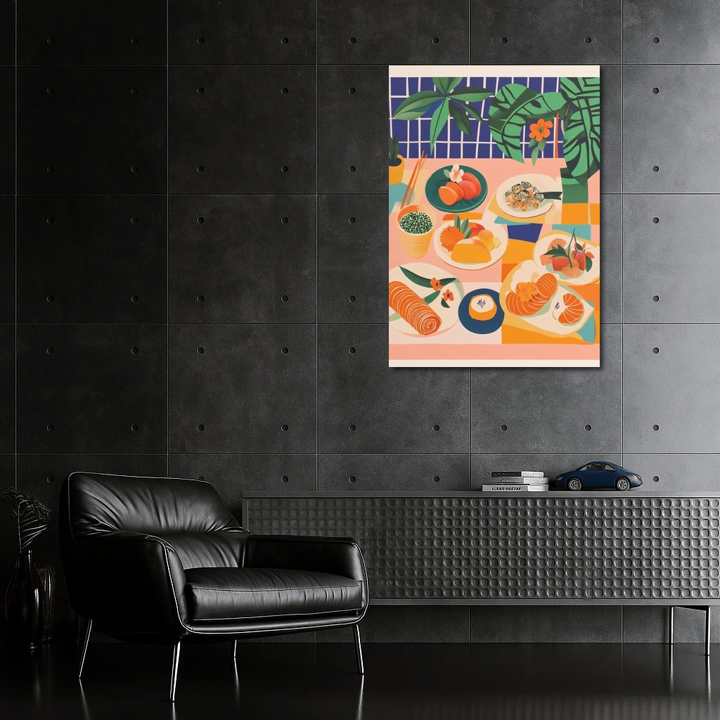 A vibrant poster featuring gourmet dishes and exotic plants. Wall art that adds coziness and freshness to your interior. See more from the collection: Pop Art