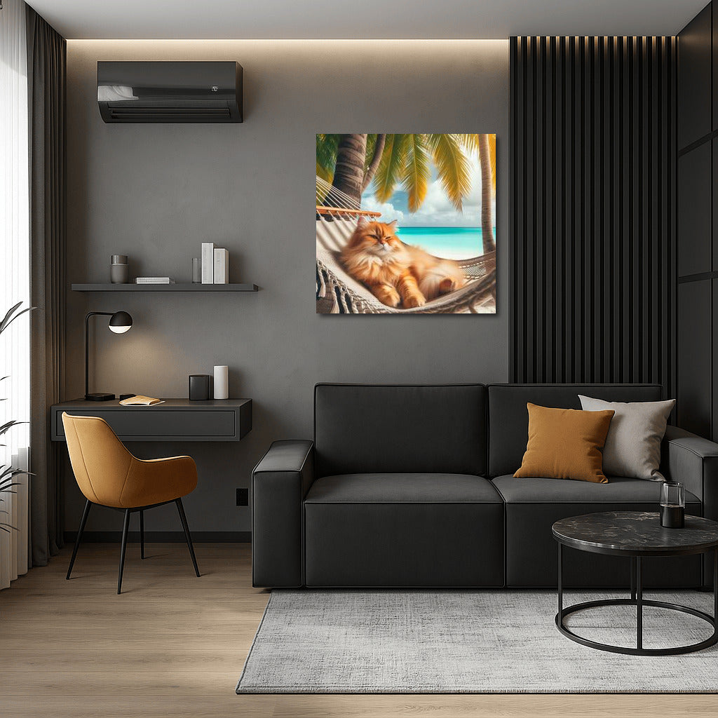 Poster Cat in Tropical Paradise 4: A fluffy cat enjoys relaxing in a hammock under palm trees, creating an atmosphere of serenity and warmth. See more from the collection: Animals Art