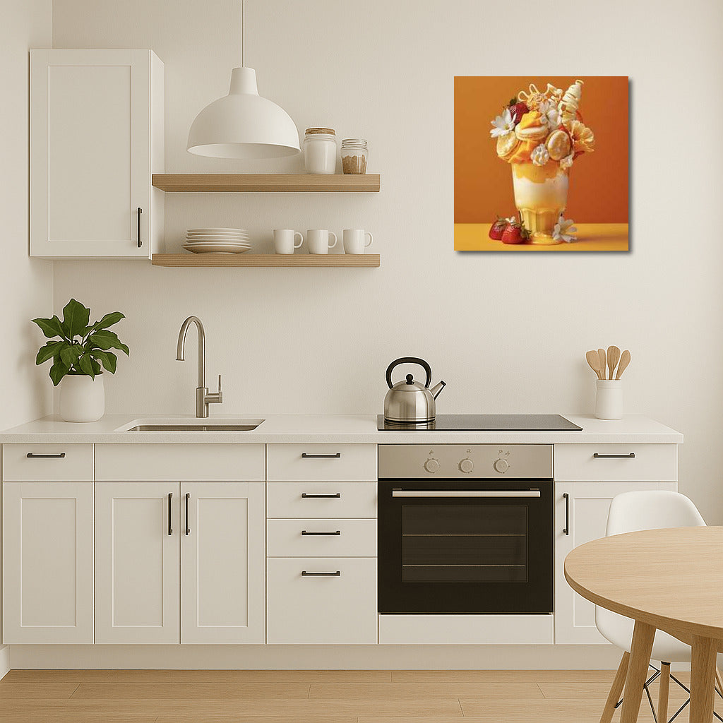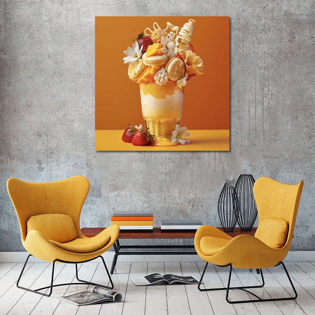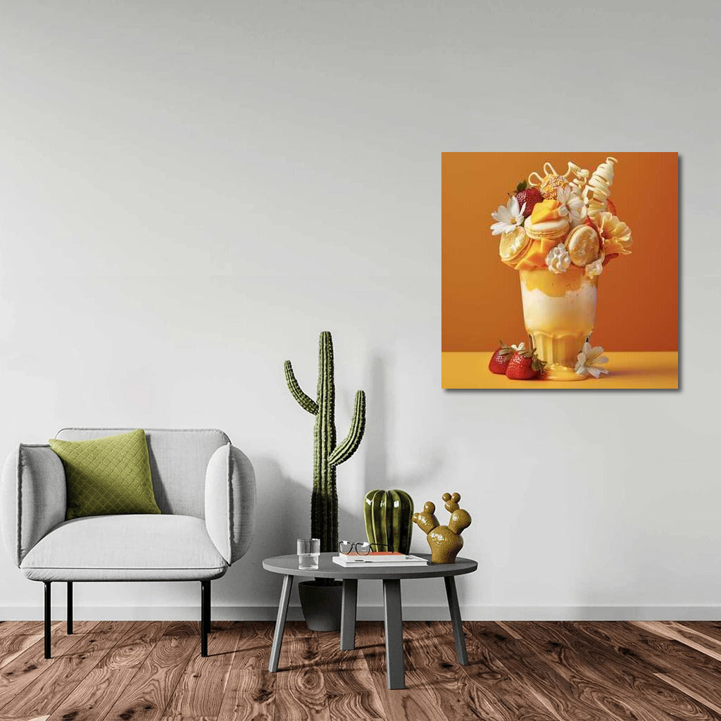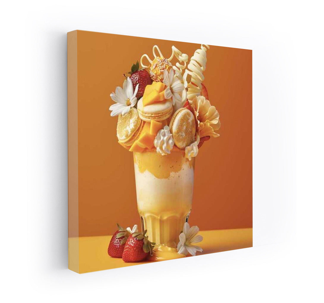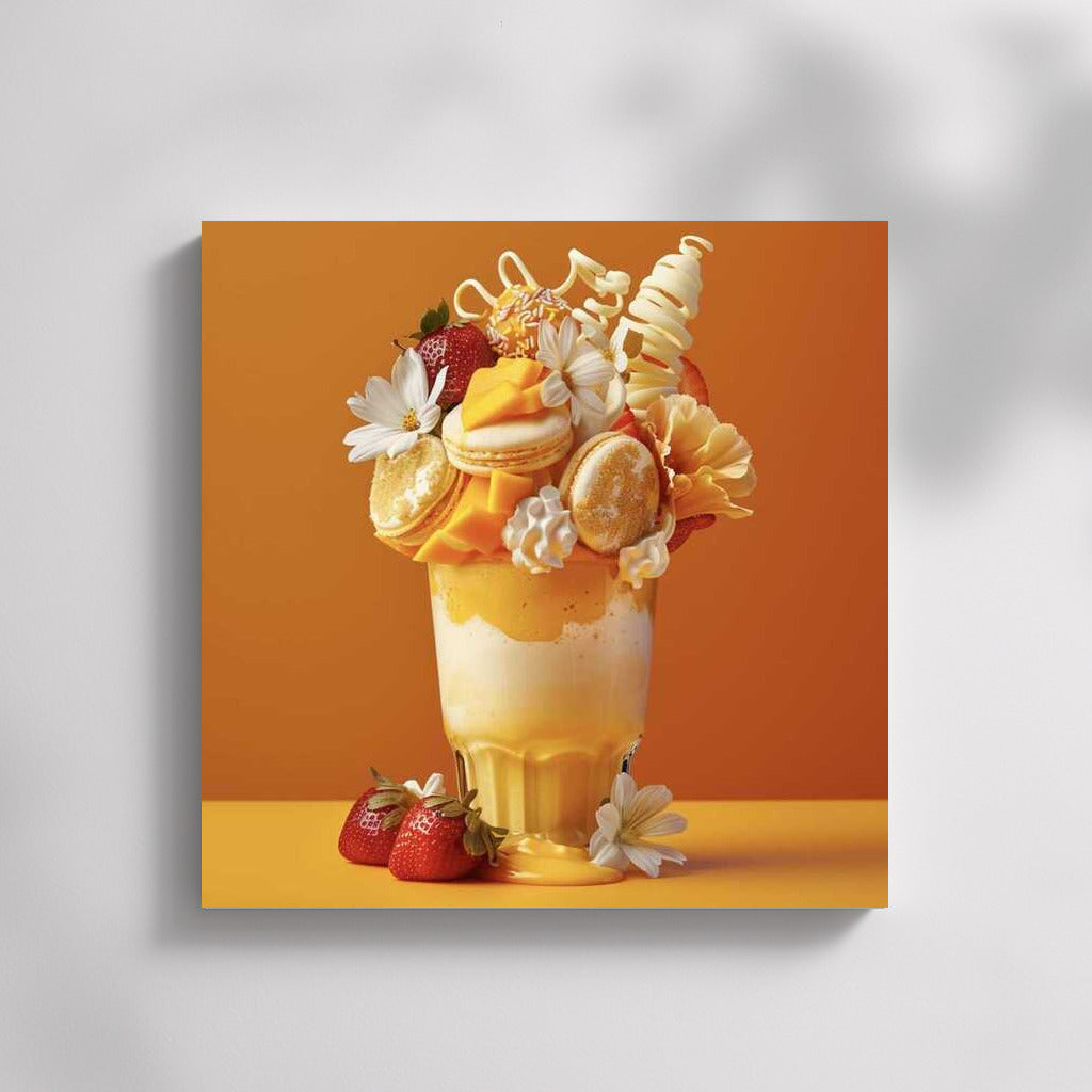Big Drinks wall art: a bright dessert shake with macarons, flowers and strawberries. Exotic in every look! See more from the collection: Coffee & Tea Art & Drinks