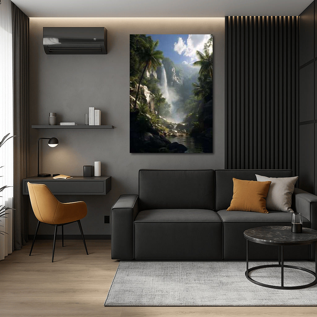 A tropical paradise comes alive on your wall. A paintingsque waterfall embodies the tranquility of nature. Perfect wall art. See more from the collection: Nature & Landscapes Art
