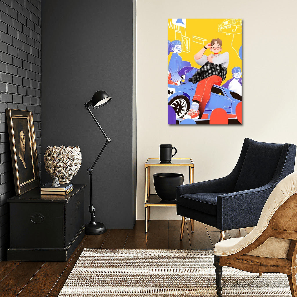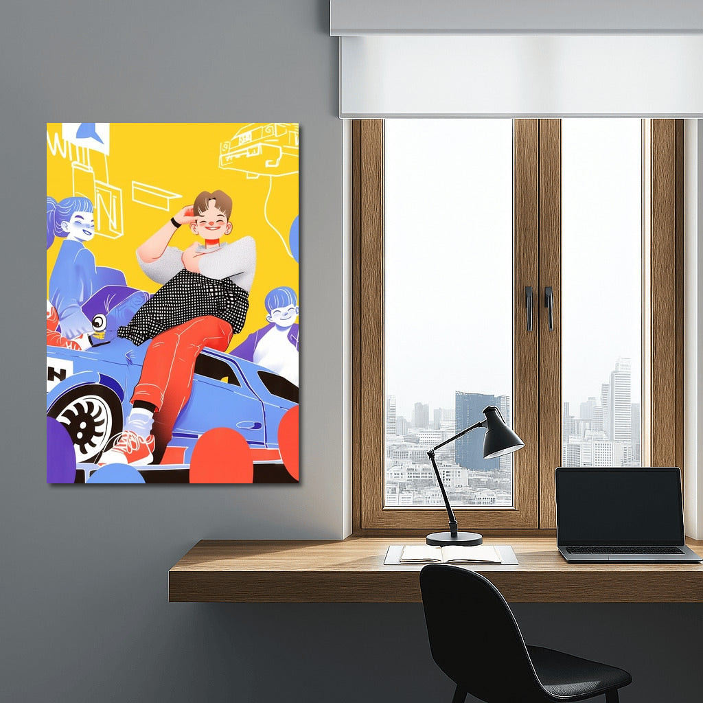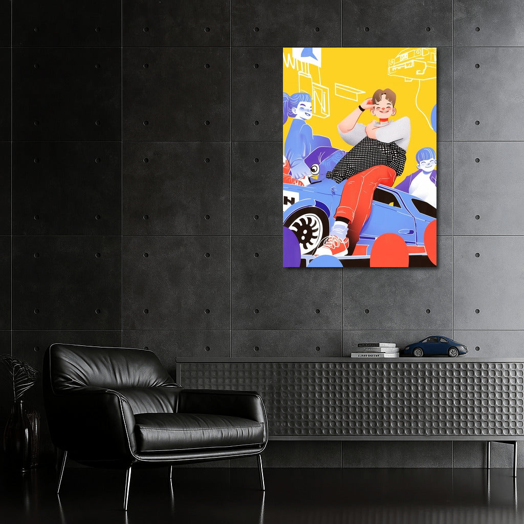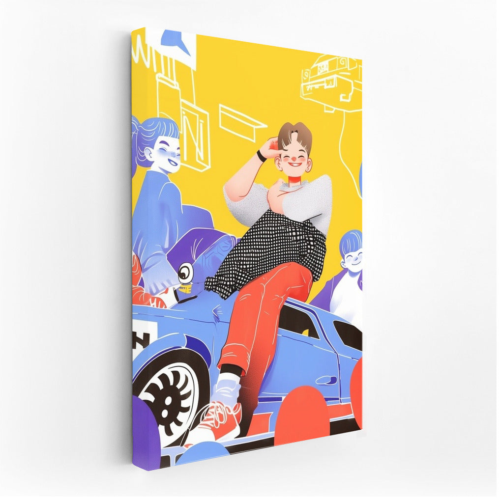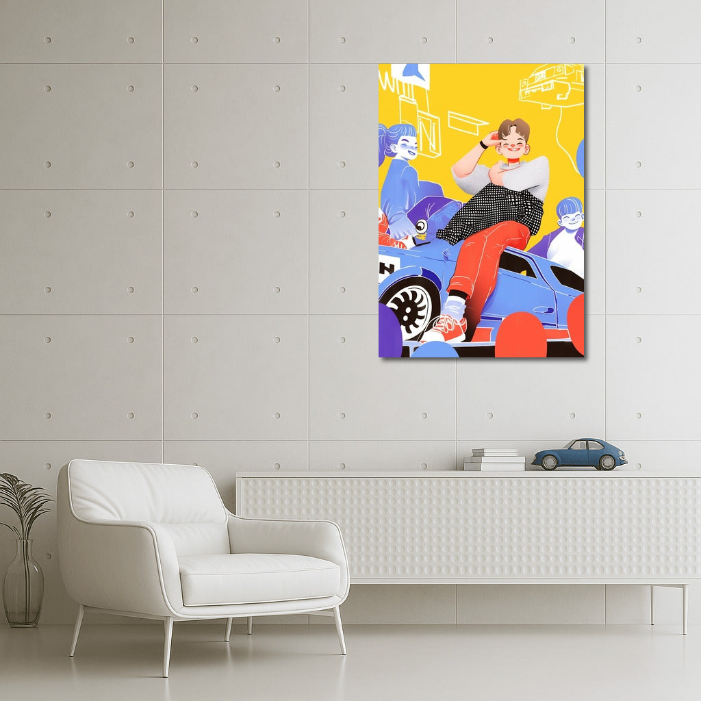 A bright poster with cheerful characters and a stylish sports car. Create an atmosphere of joy with this unique wall art! See more from the collection: Mixed Wall Art