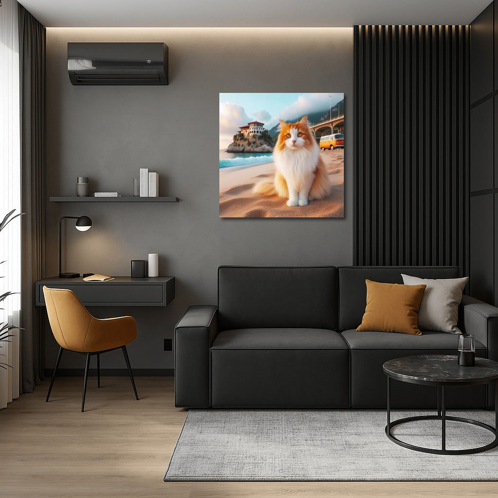 Elegant poster: Turkish Van on a stylish beach with a house by the sea and a retro Volkswagen. Perfect wall art for a cozy atmosphere! See more from the collection: Animals Art