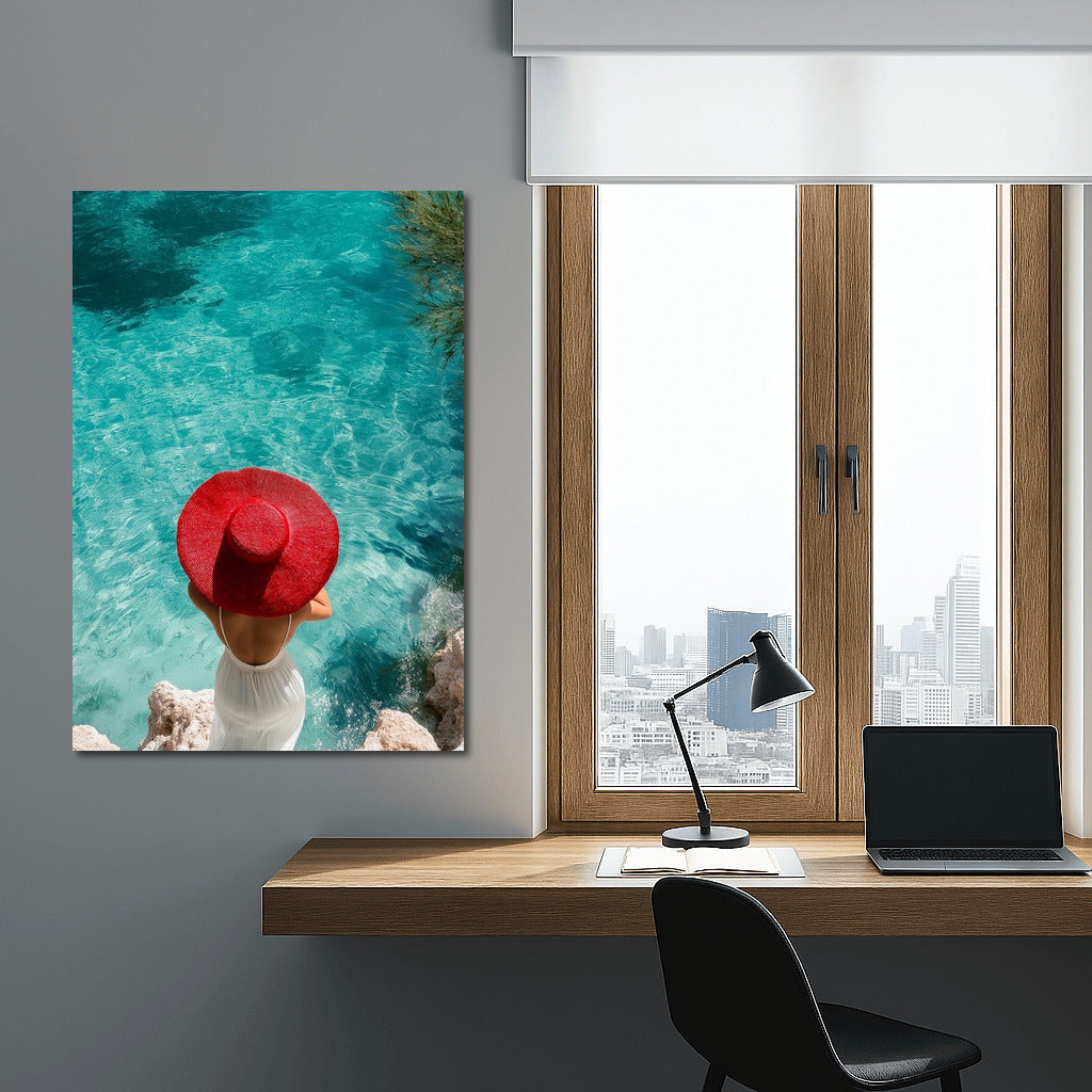 Summer spirit and turquoise freshness: a poster with a figure by the water and a bright hat. Wall art that fills the house with warmth. See more from the collection: Mixed Wall Art