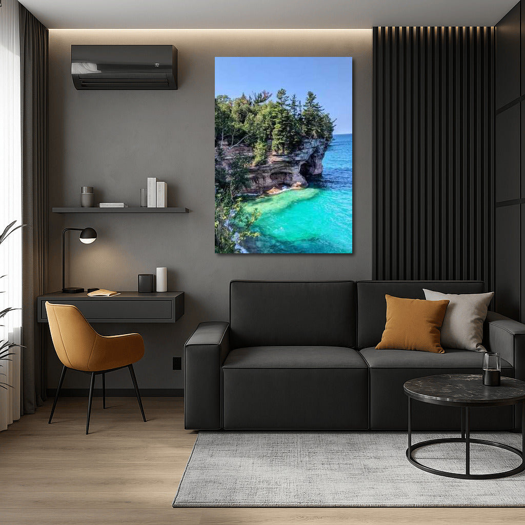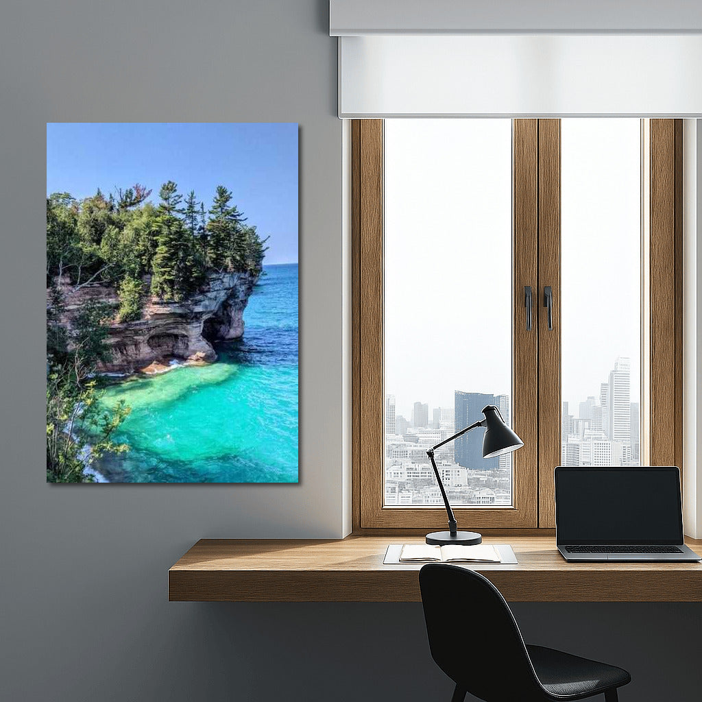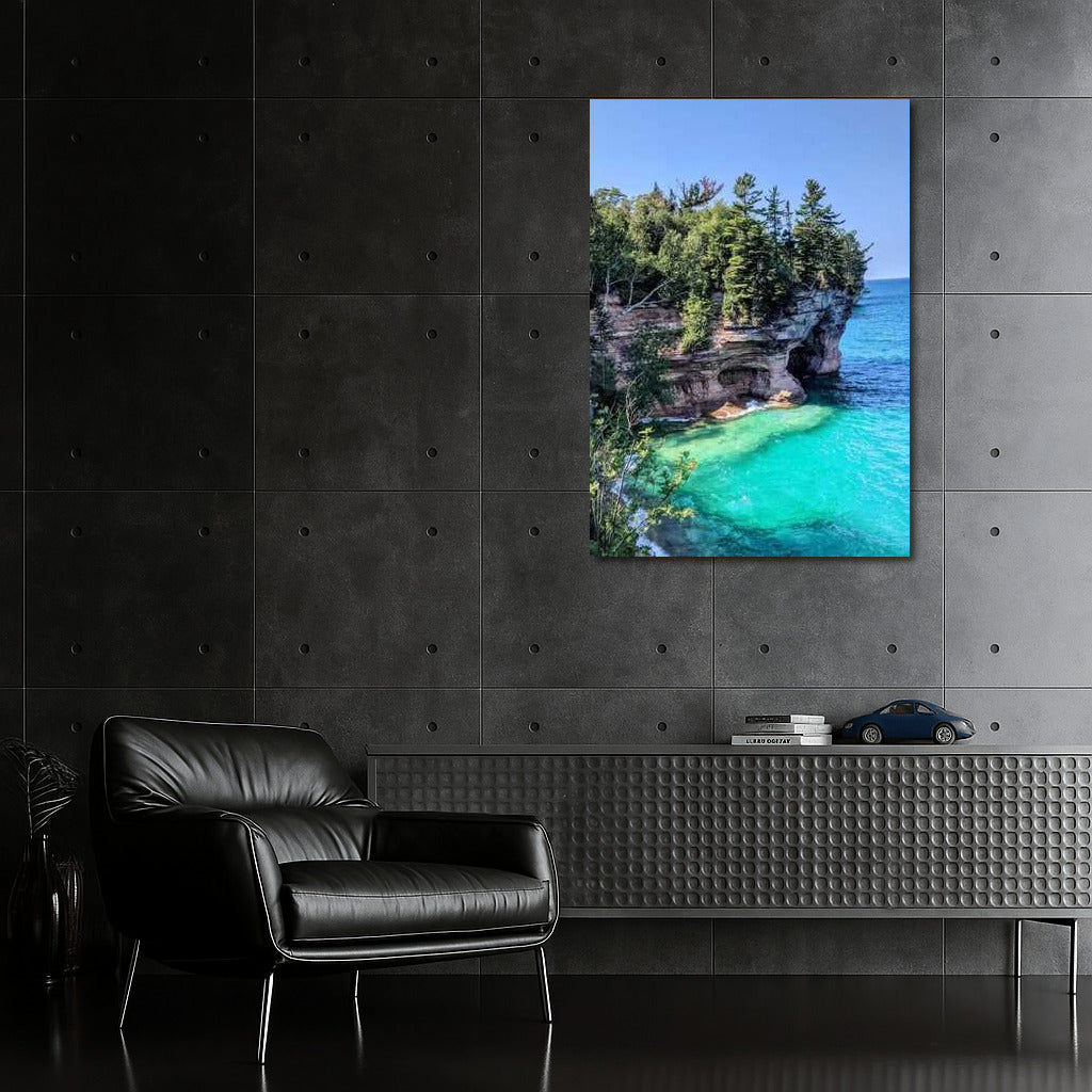 The turquoise waters and rocky shores of Michigan. This poster is a paintingsque wall art that brings nature to life. See more from the collection: Country Art