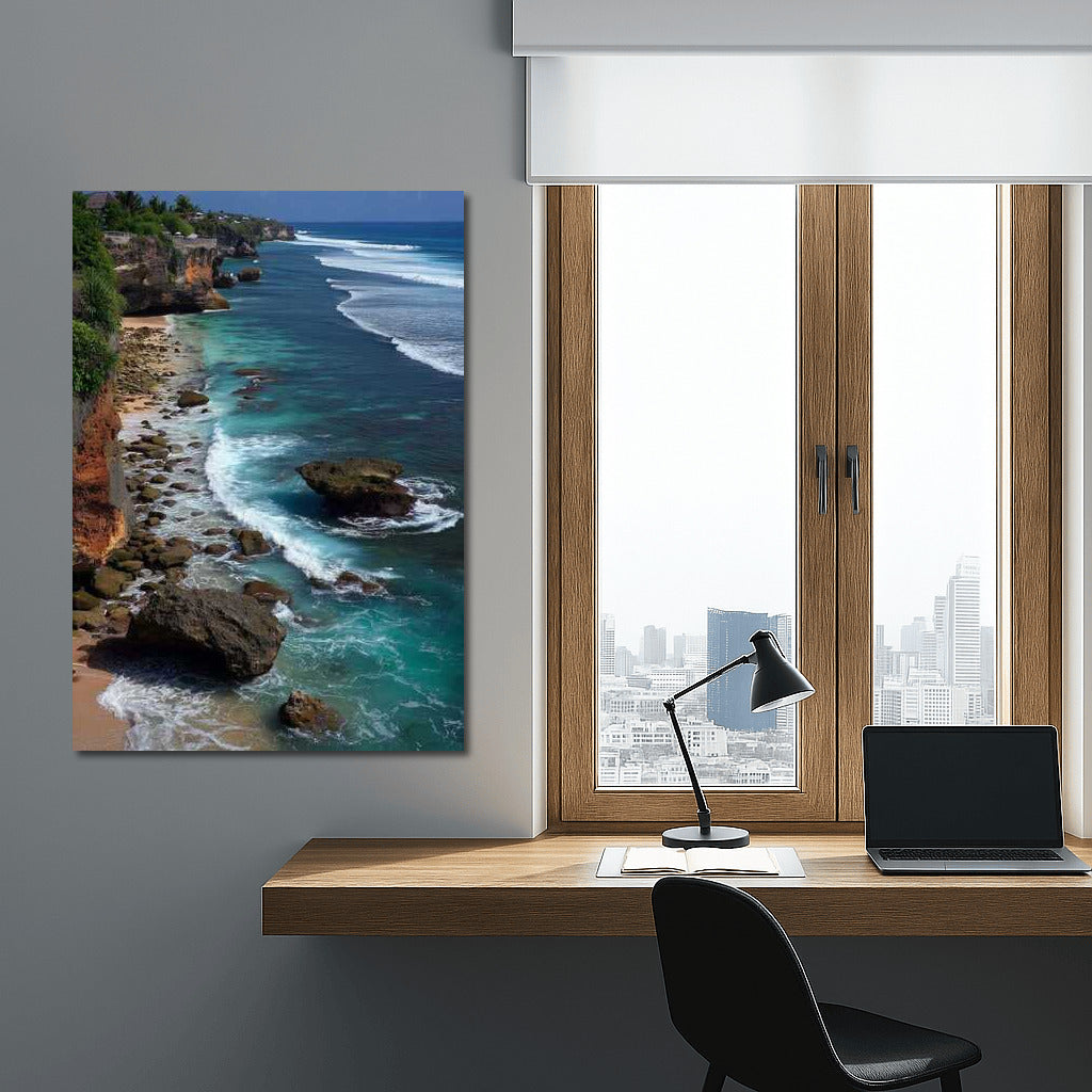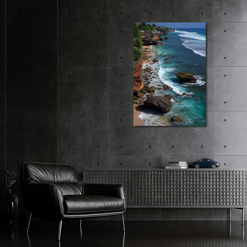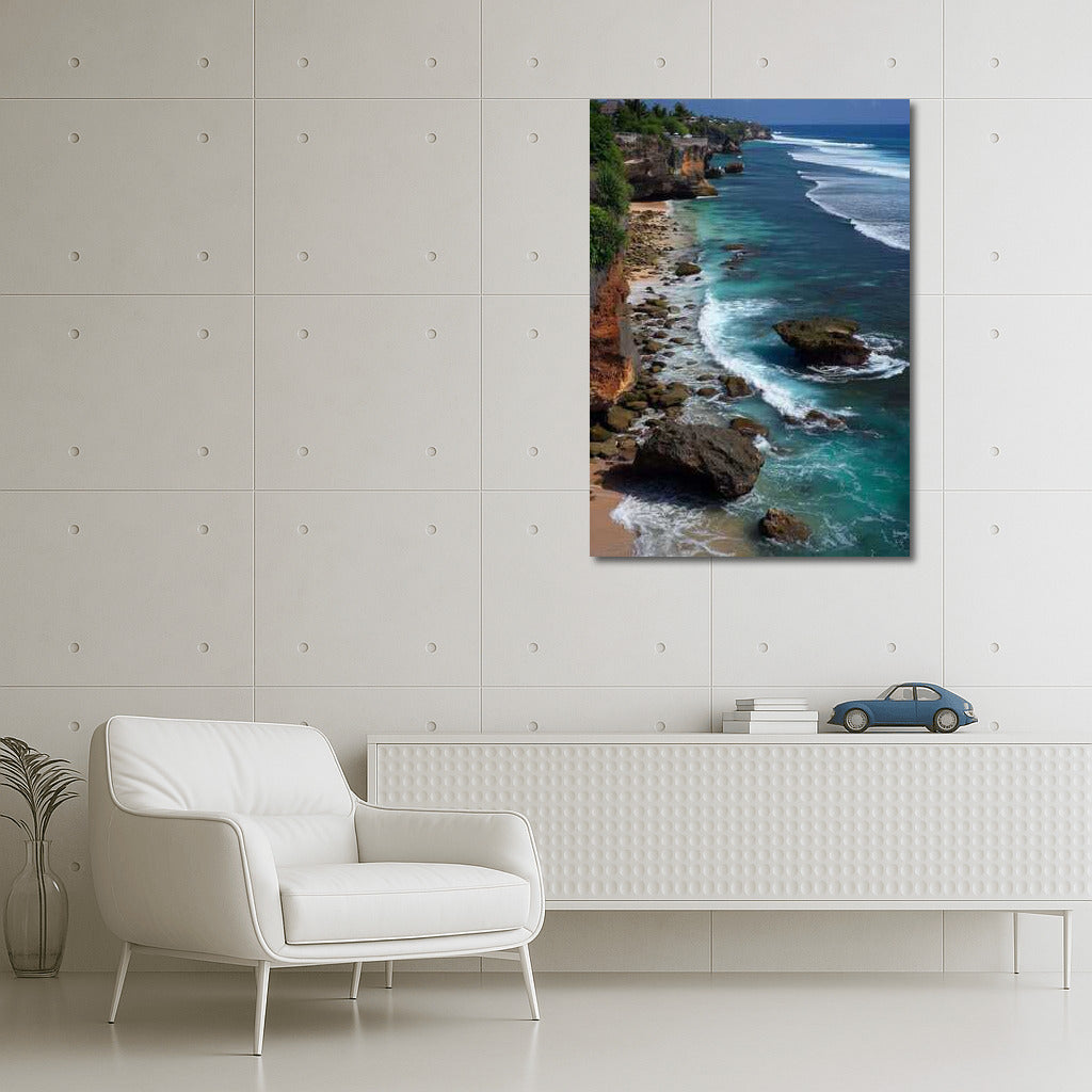 Immerse yourself in the magic of Indonesia's coastline with our poster of turquoise waves caressing rocky shores. Dream wall art! See more from the collection: Country Art
