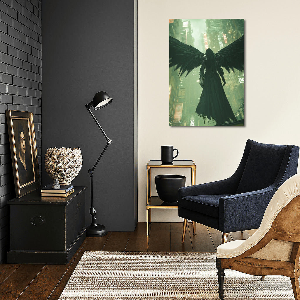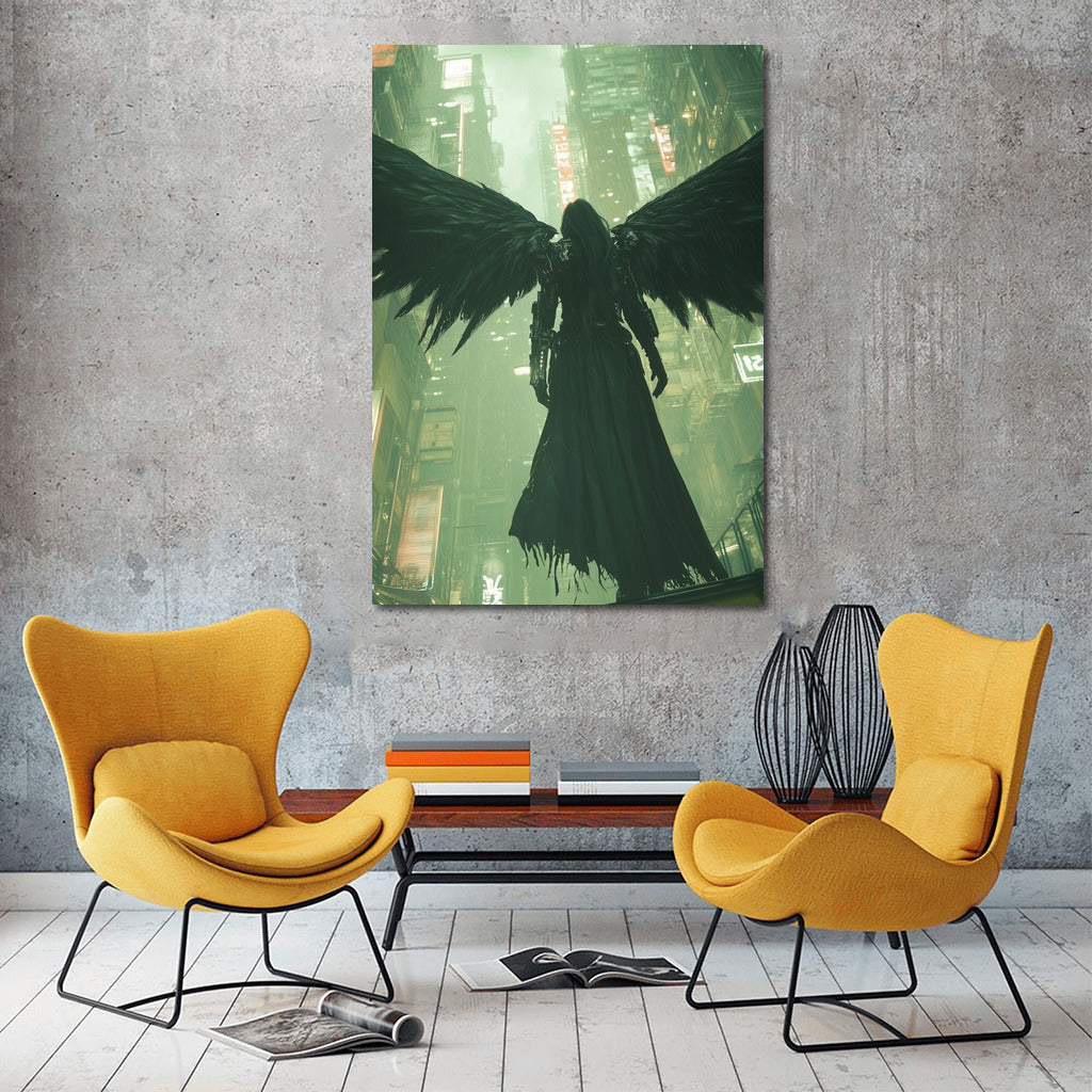Dark angel hovers over neon city. Add mysticism to your interior with this mesmerizing painting. Cyberpunk wall art. See more from the collection: Mixed Wall Art