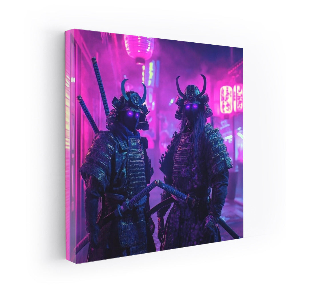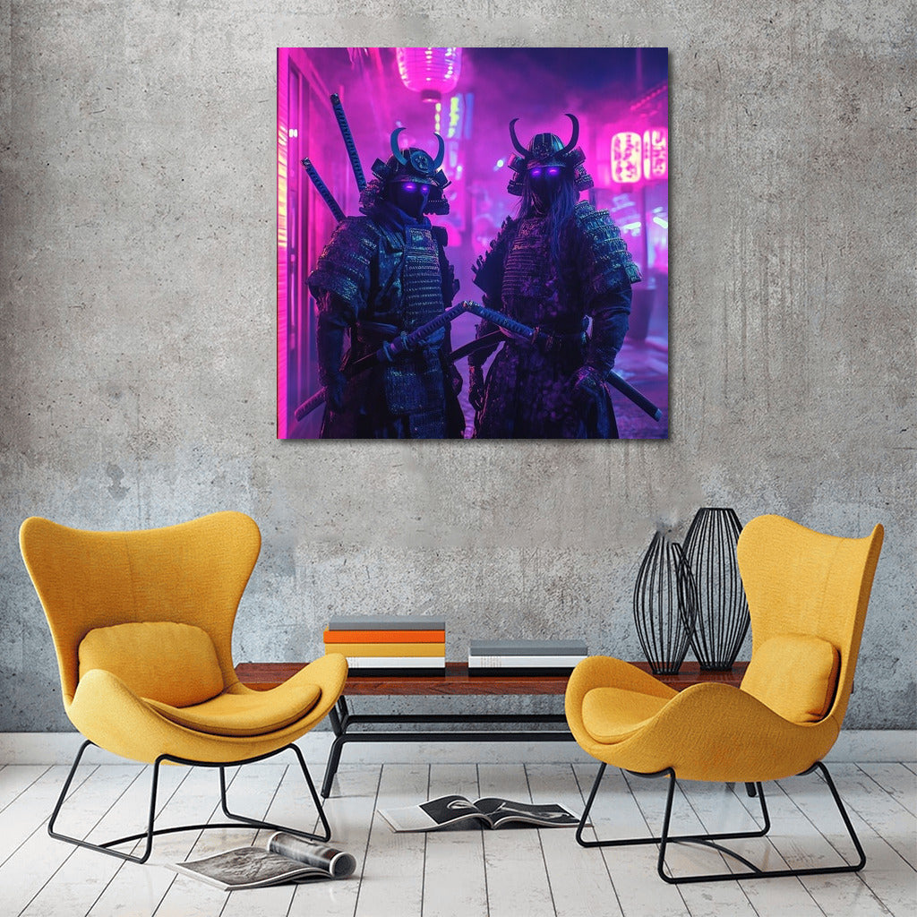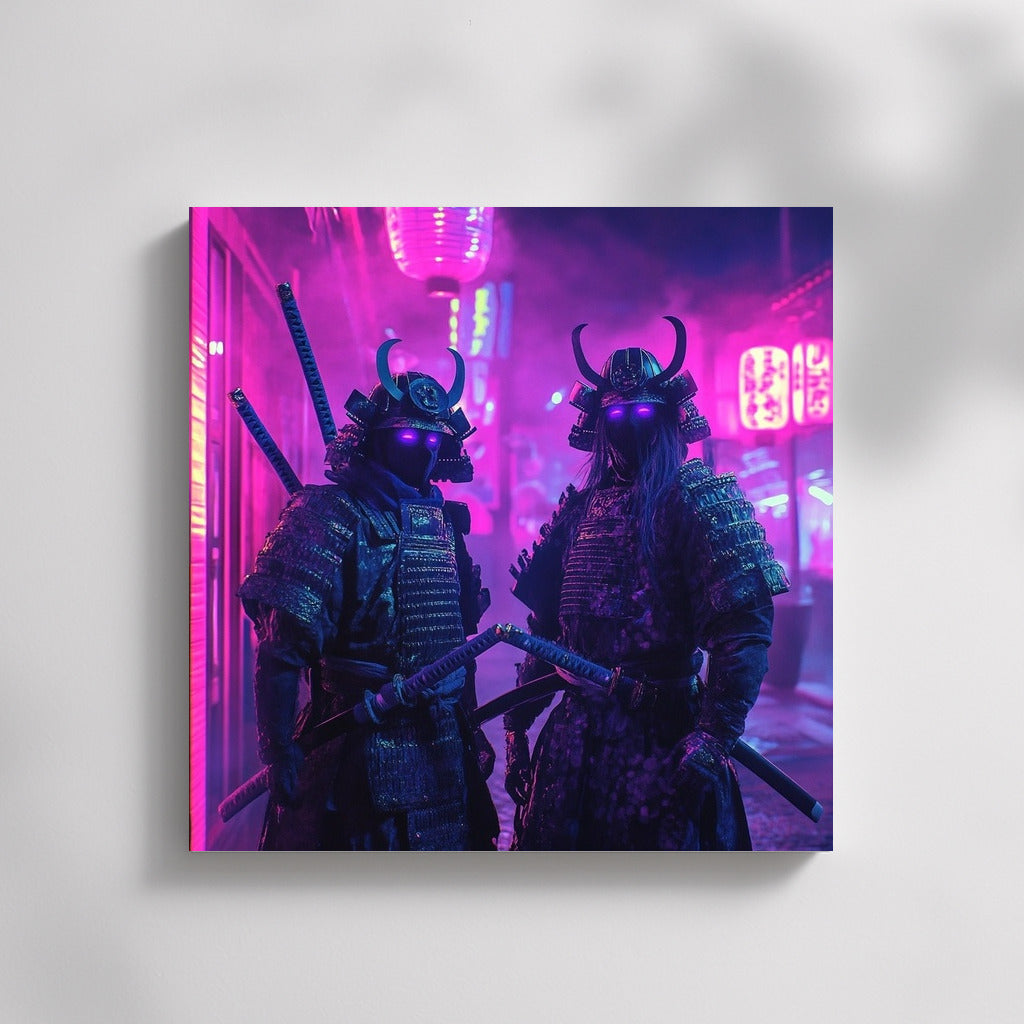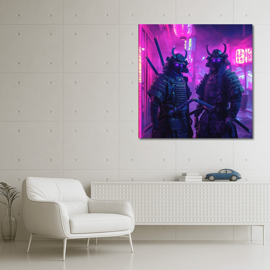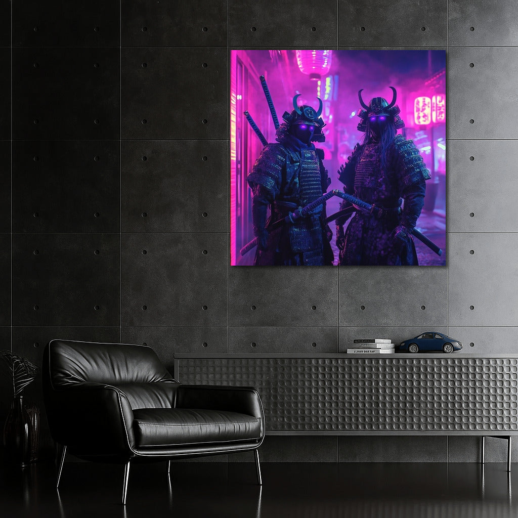 Neon fantasy: mysterious warriors in the glow of purple lights. This poster will become a bright accent in your wall art! See more from the collection: Neon Art