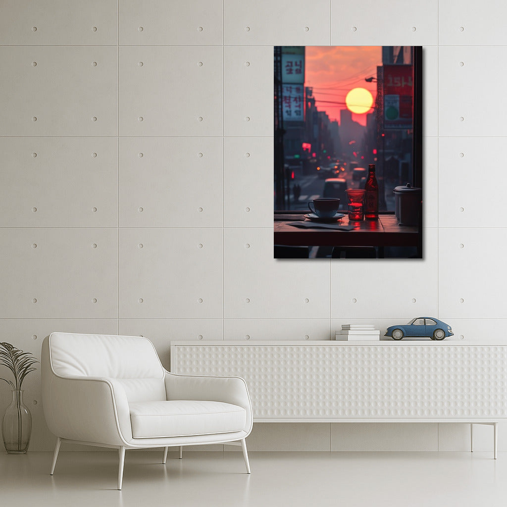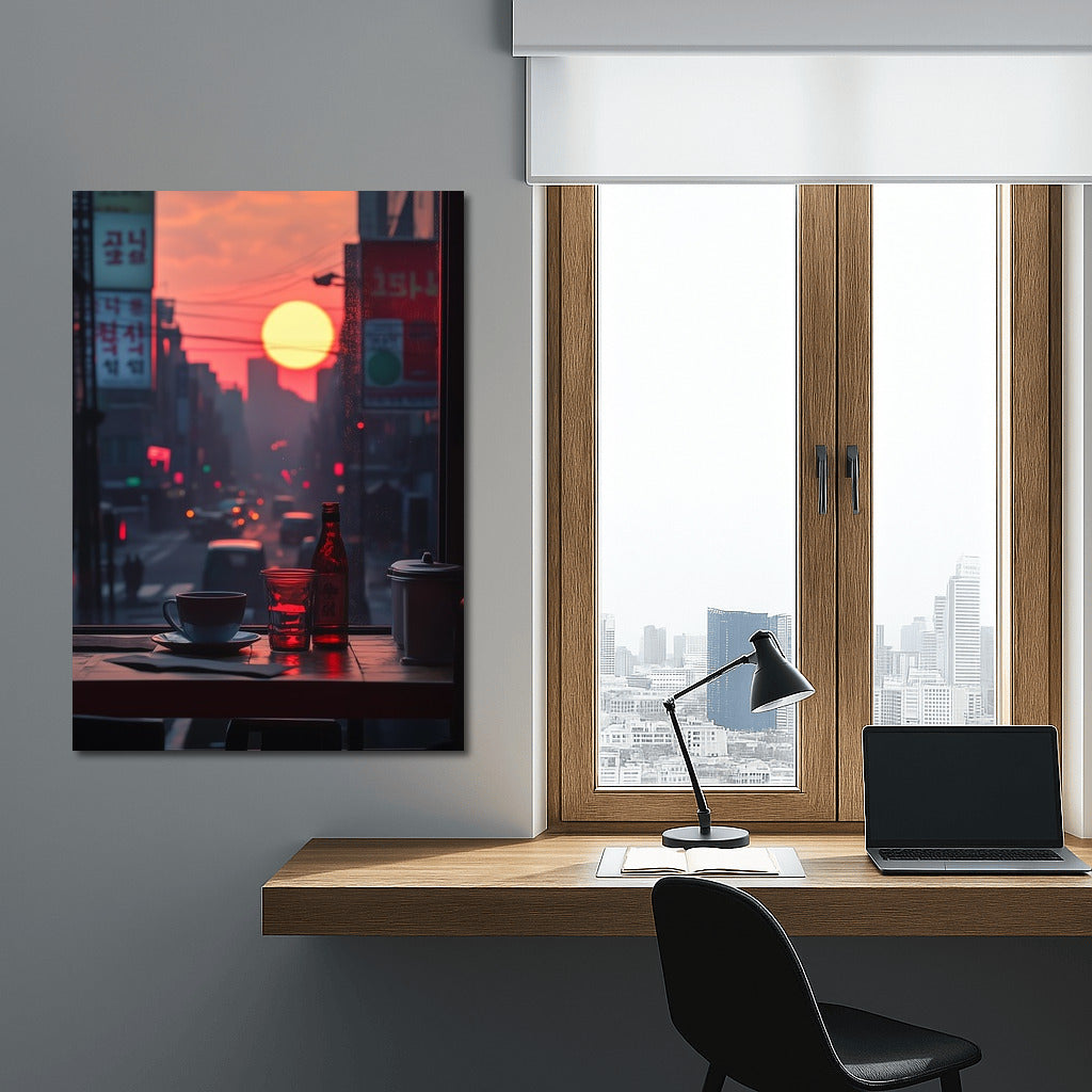 Evening city and shimmering sunset outside the window. Poster with an atmosphere of coziness and mystery, perfect wall art for inspiration. See more from the collection: Nature & Landscapes Art