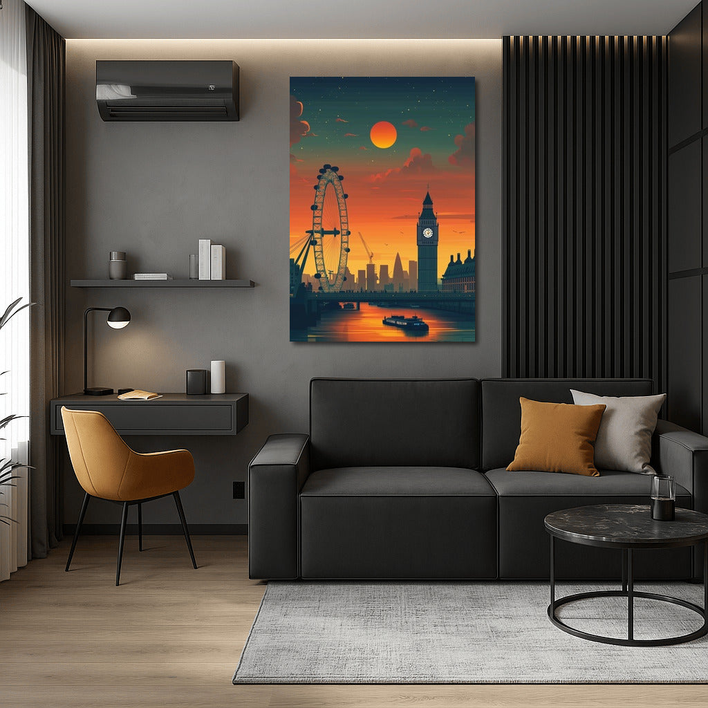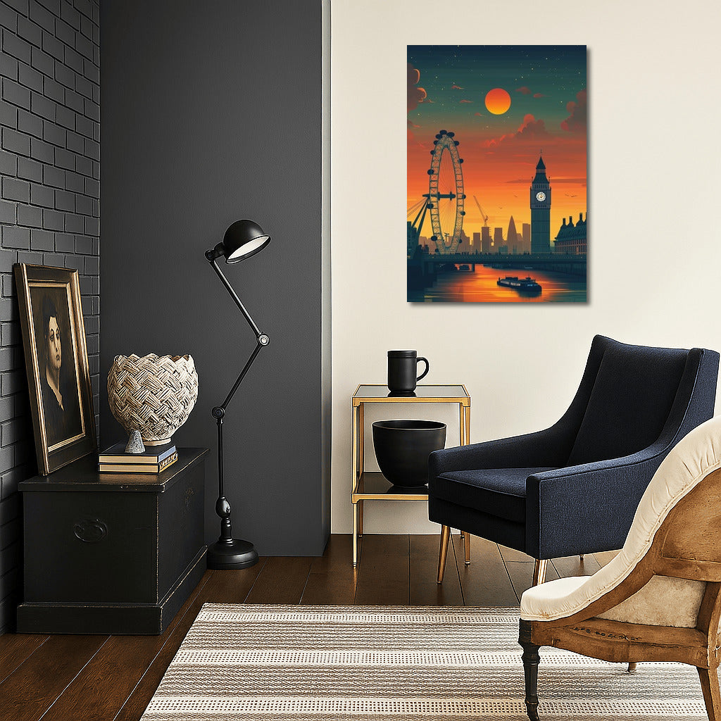 London in sunset colors in this poster. Stylish wall art with a view of the ferris wheel and clock tower. See more from the collection: Cityscapes & Skylines Art