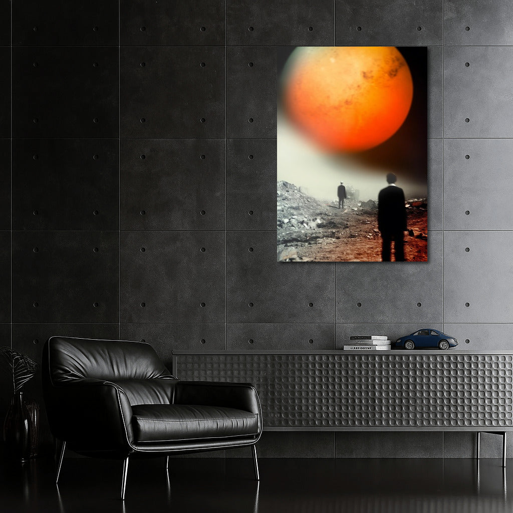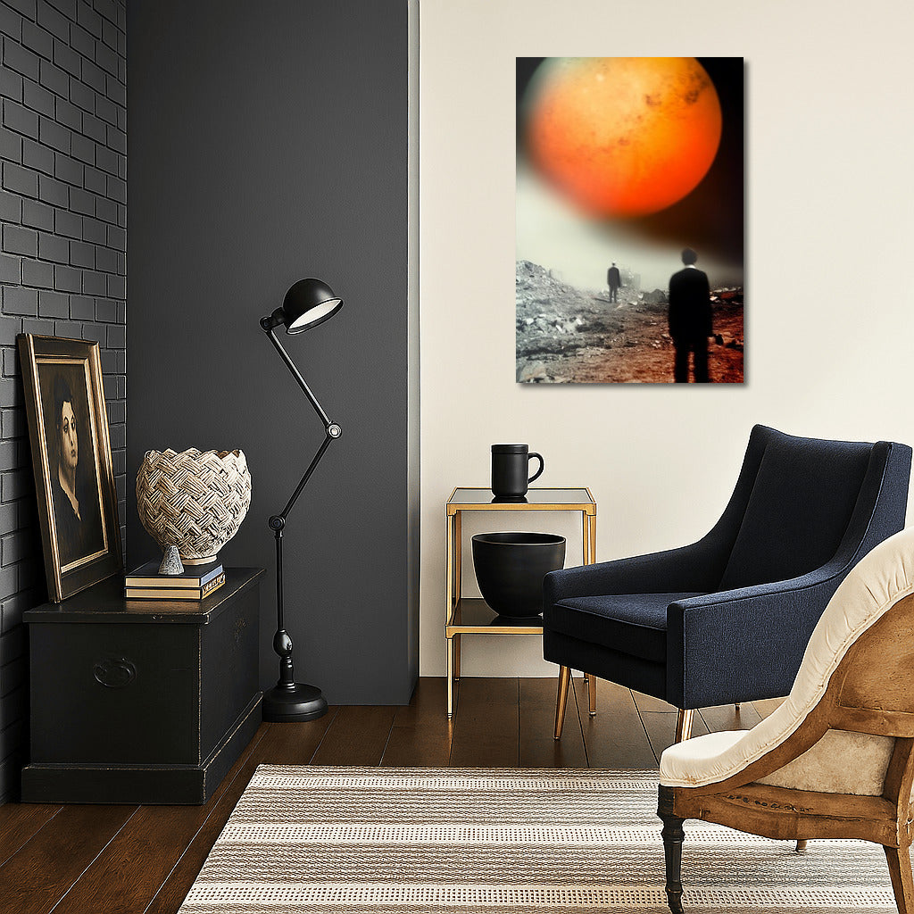 Mystical wall art: Two people walking through a mysterious landscape under a mysterious planet. A poster that sparks imagination. See more from the collection: Mixed Wall Art