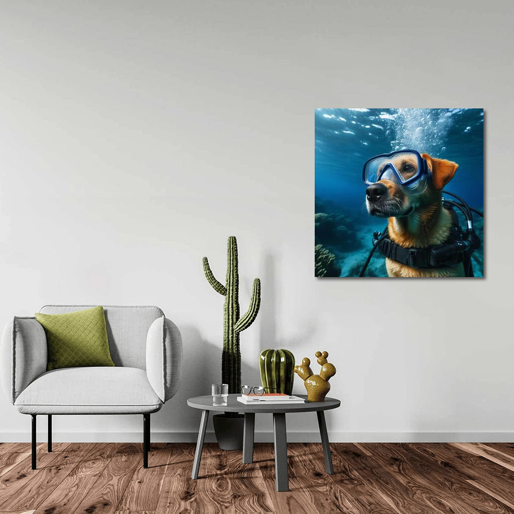 Dive into underwater adventures with this paintingsque poster: a dog in scuba gear discovers the secrets of the ocean. Dream wall art! See more from the collection: Animals Art