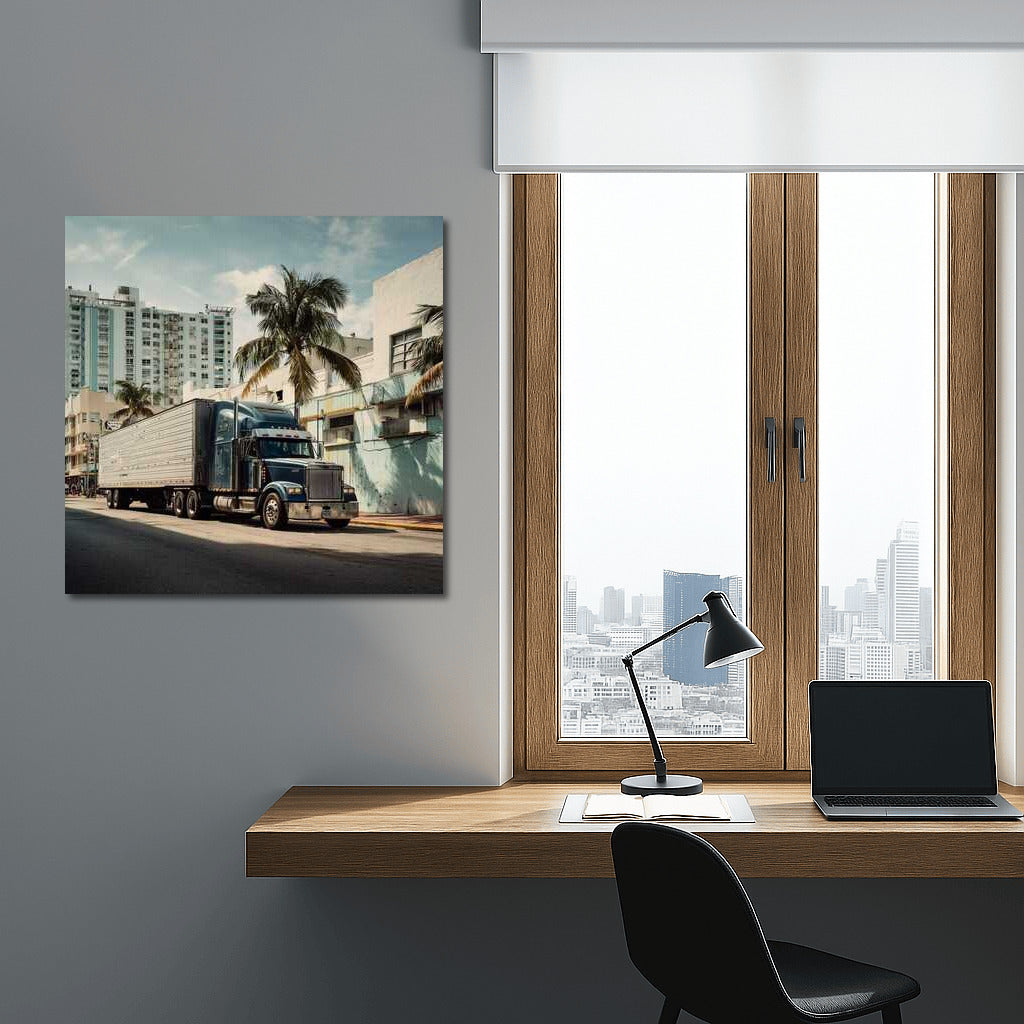 A powerful truck against the backdrop of cityscapes and palm trees. A perfect painting for lovers of transport art. See more from the collection: Transport Art