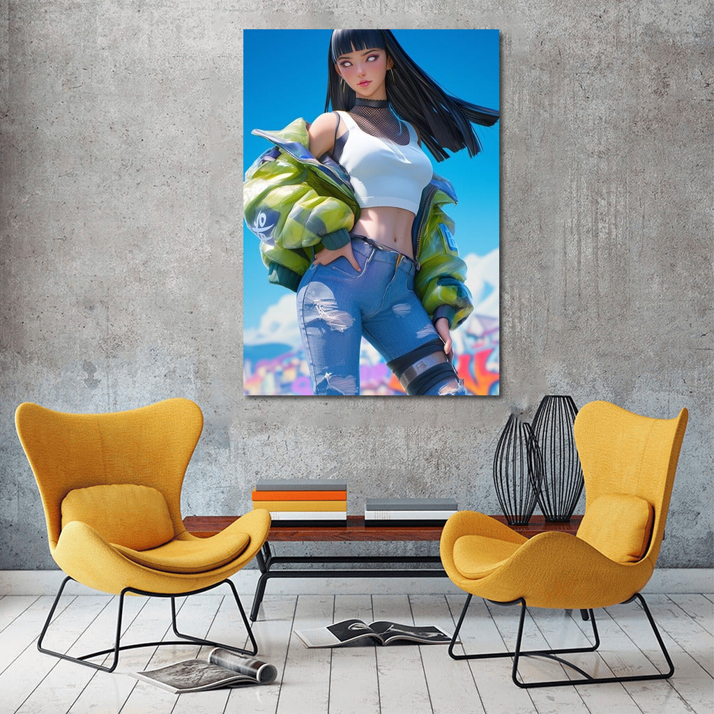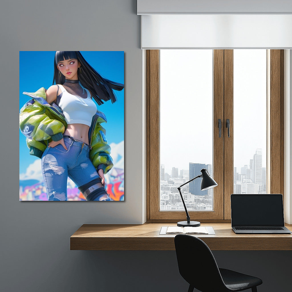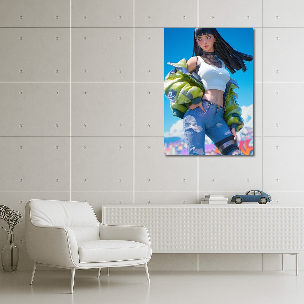 Stylish girl in a bright jacket against the backdrop of a city landscape. A modern painting that will add dynamics to any wall art. See more from the collection: Anime & Manga genres Art