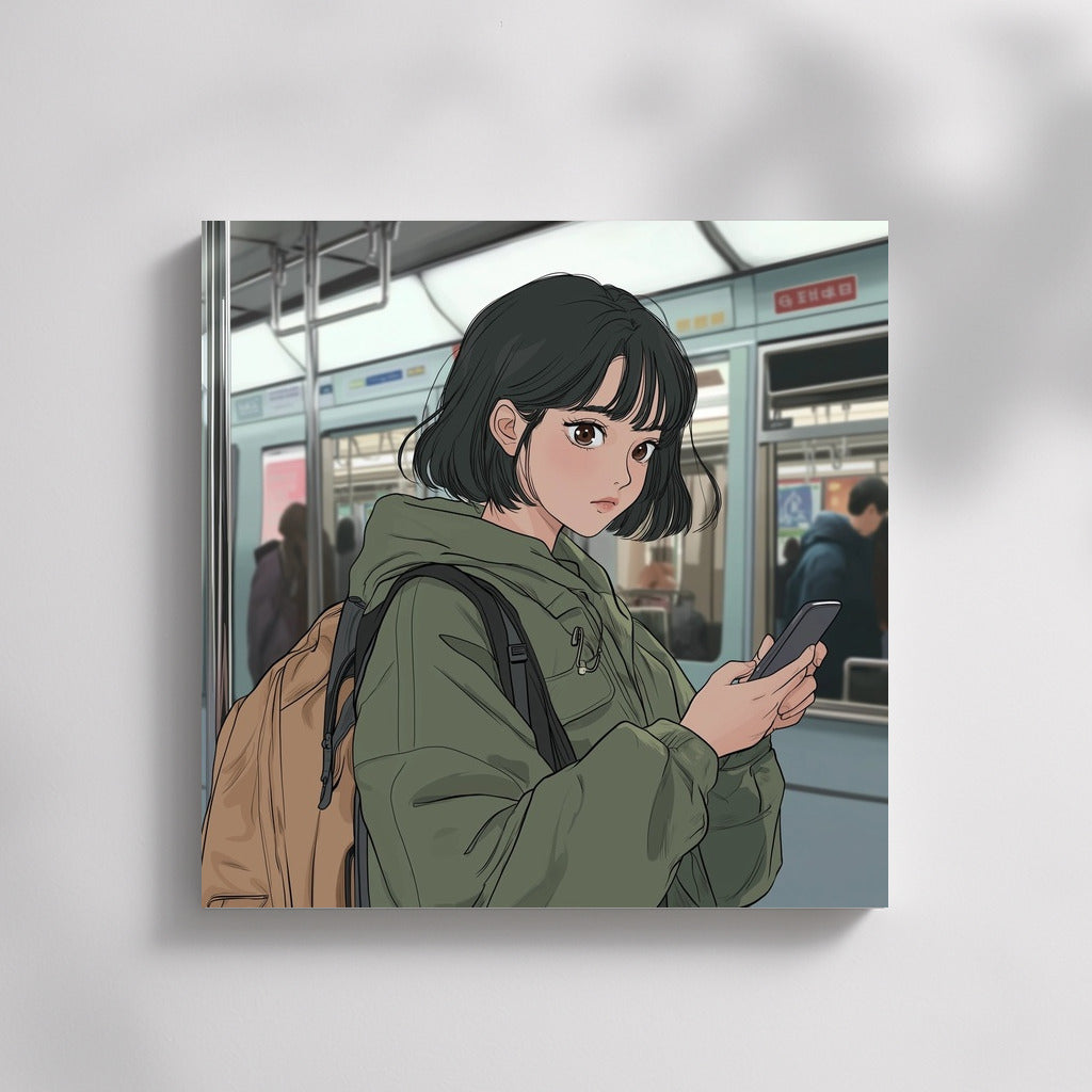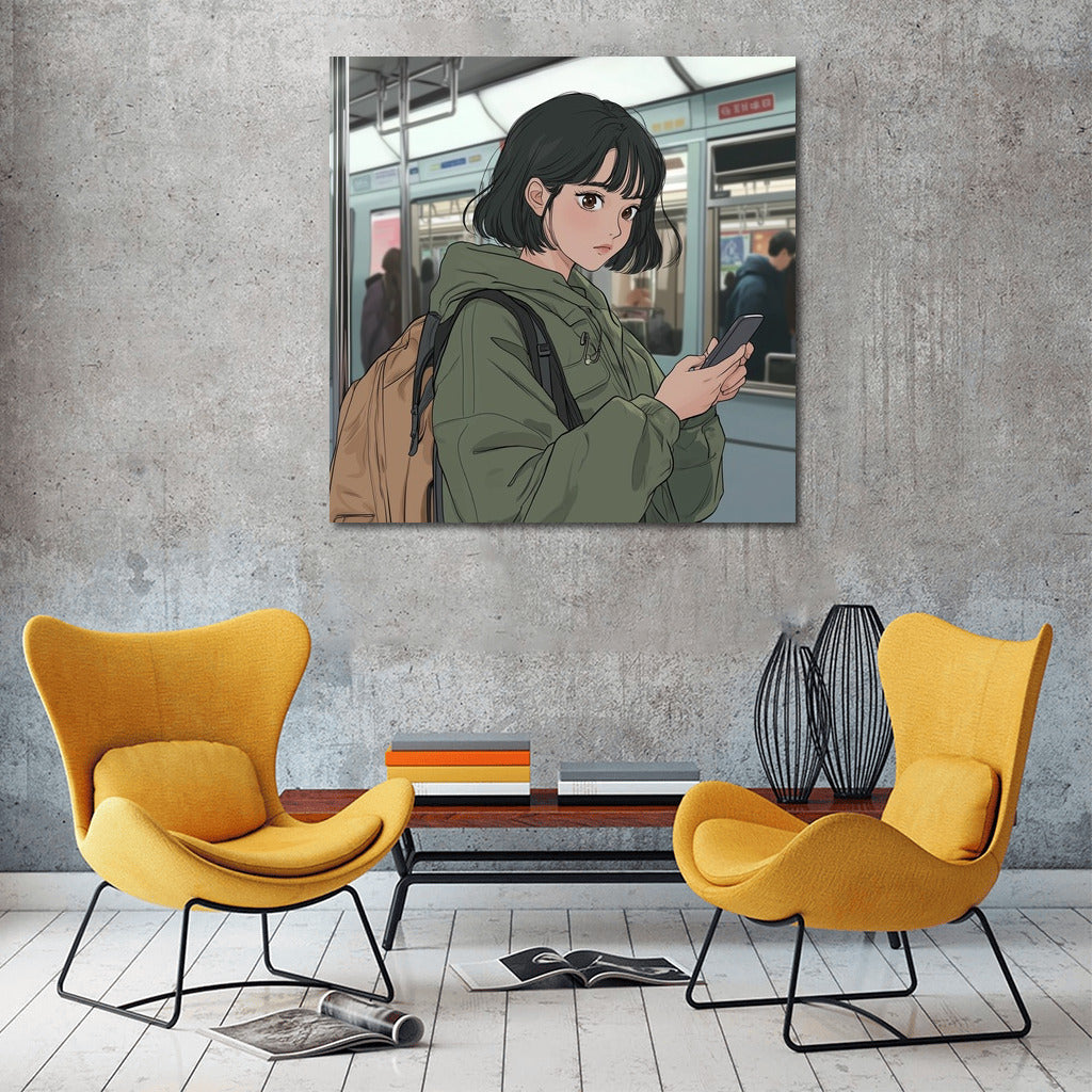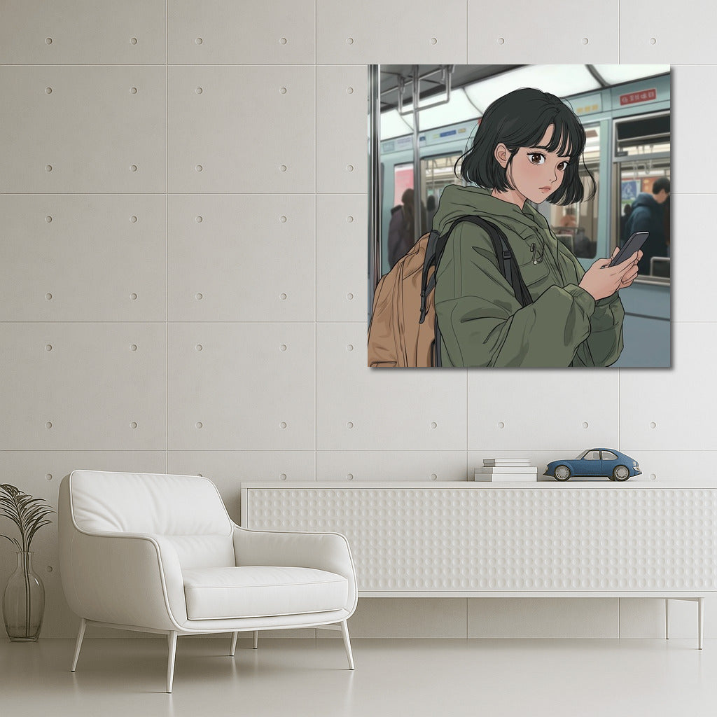 Inspirational poster: a modern traveler on the subway, lost in thought. A perfect accent for your wall art. See more from the collection: Anime & Manga genres Art
