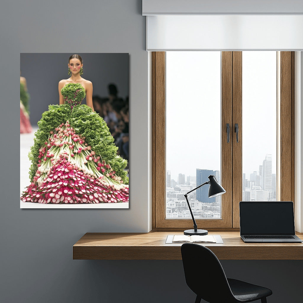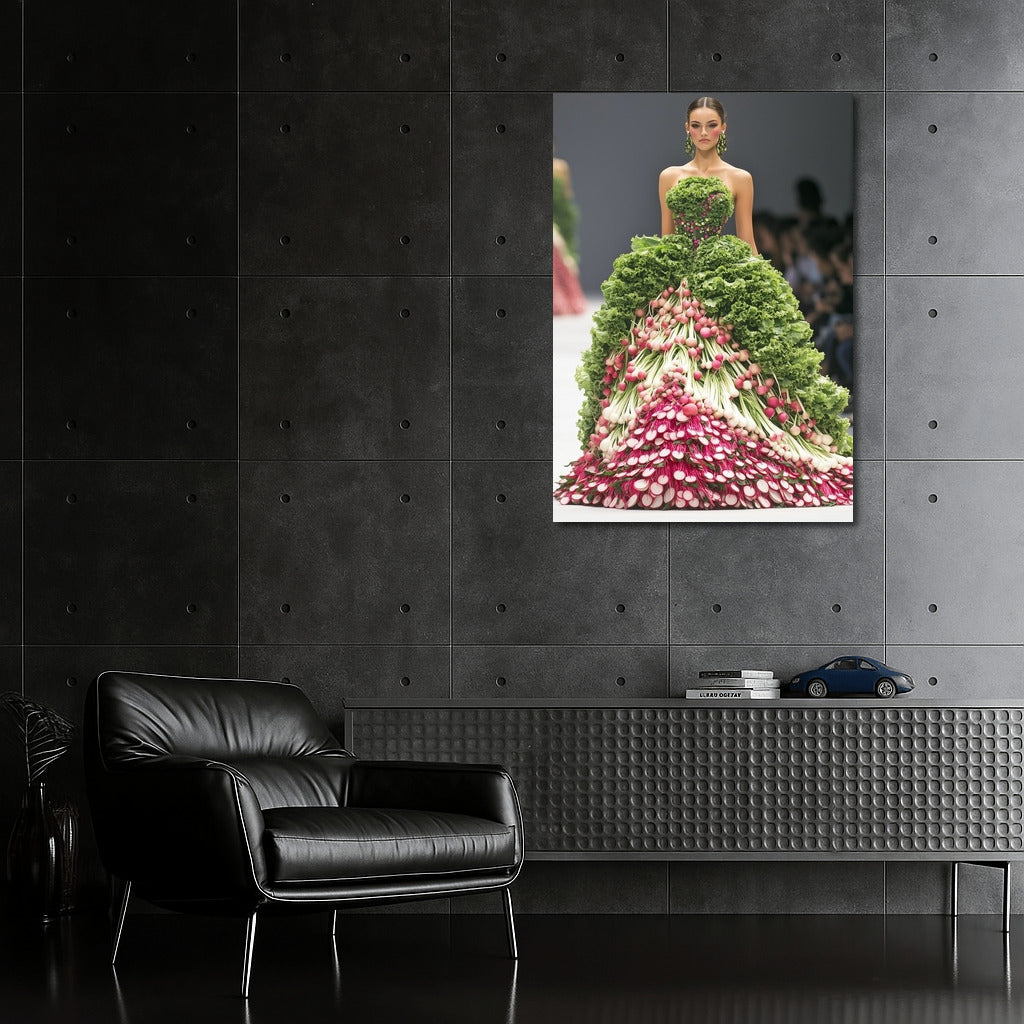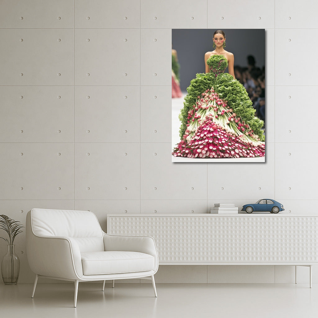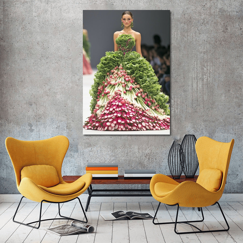 An exquisite painting of a girl in a dress made of vegetables. Wall art that adds a touch of freshness and originality to the interior. See more from the collection: Fashion Art