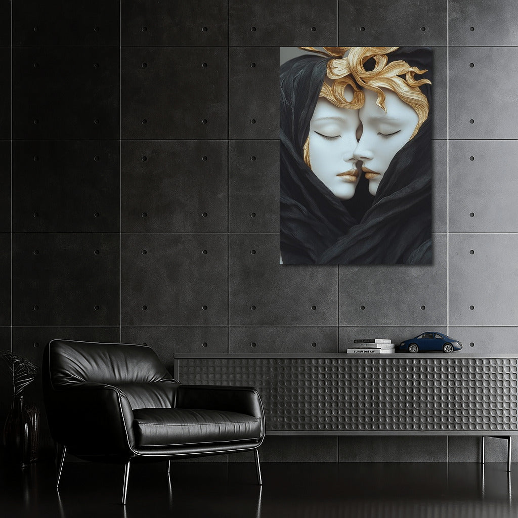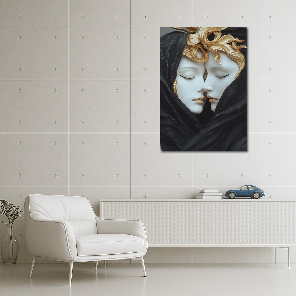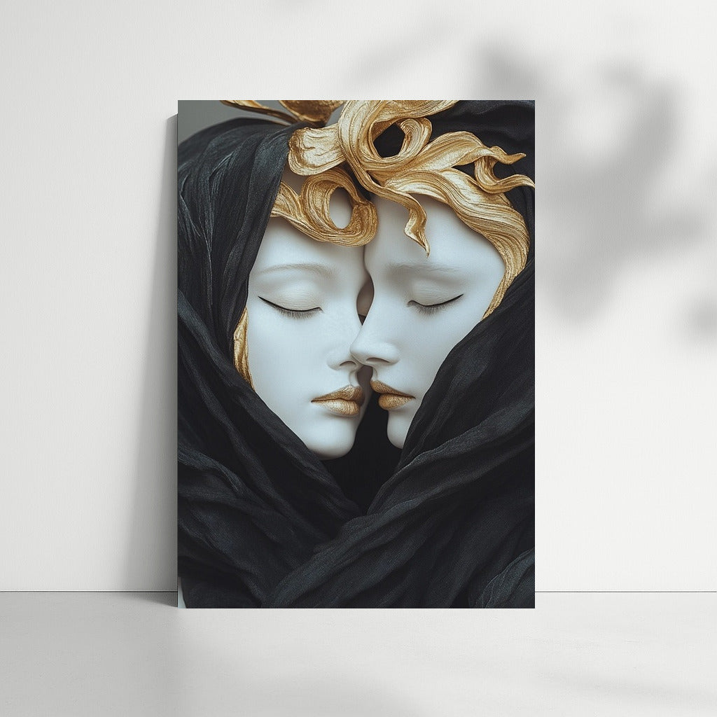 Immerse yourself in the world of art with this mysterious painting: two figures wrapped in a veil radiate harmony and mystery. Wall magic! See more from the collection: Mixed Wall Art