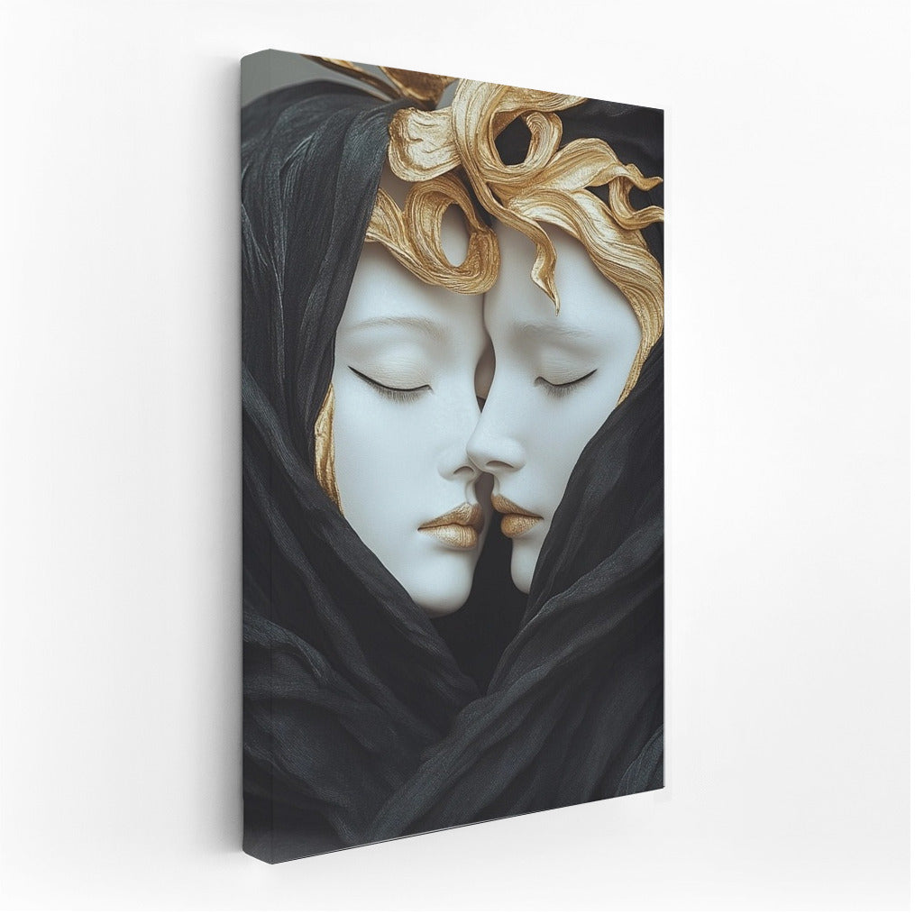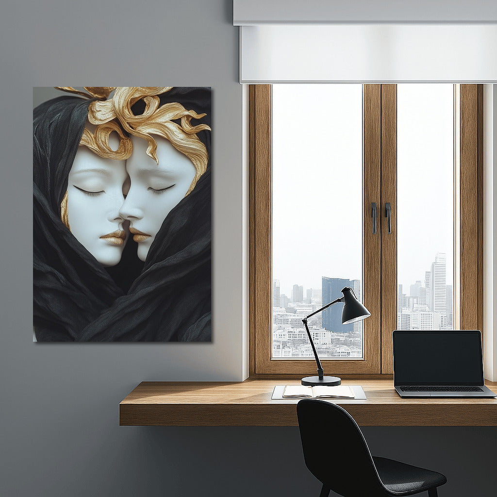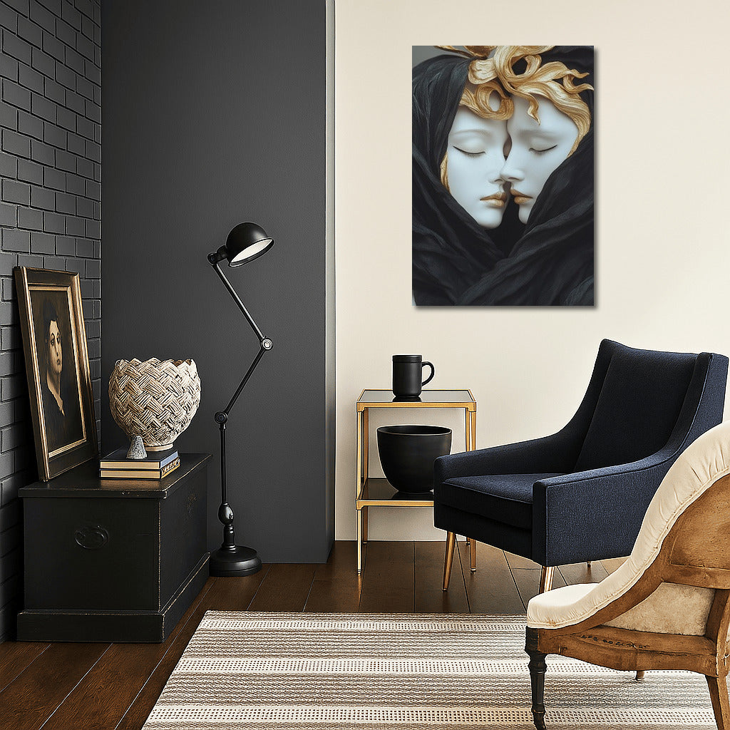 Immerse yourself in the world of art with this mysterious painting: two figures wrapped in a veil radiate harmony and mystery. Wall magic! See more from the collection: Mixed Wall Art