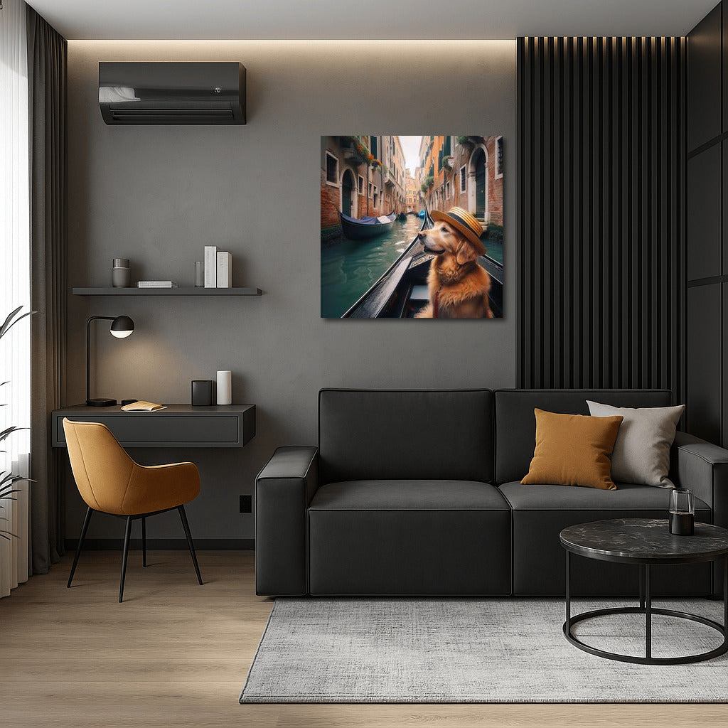 Immerse yourself in the atmosphere of Venice with this charming painting: a dog in a hat enjoying a gondola ride. Wall art! See more from the collection: Animals Art