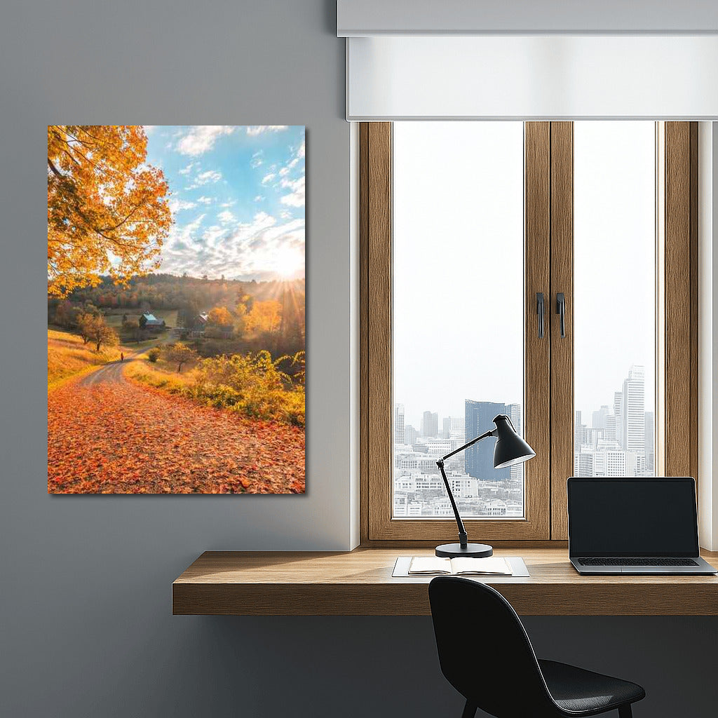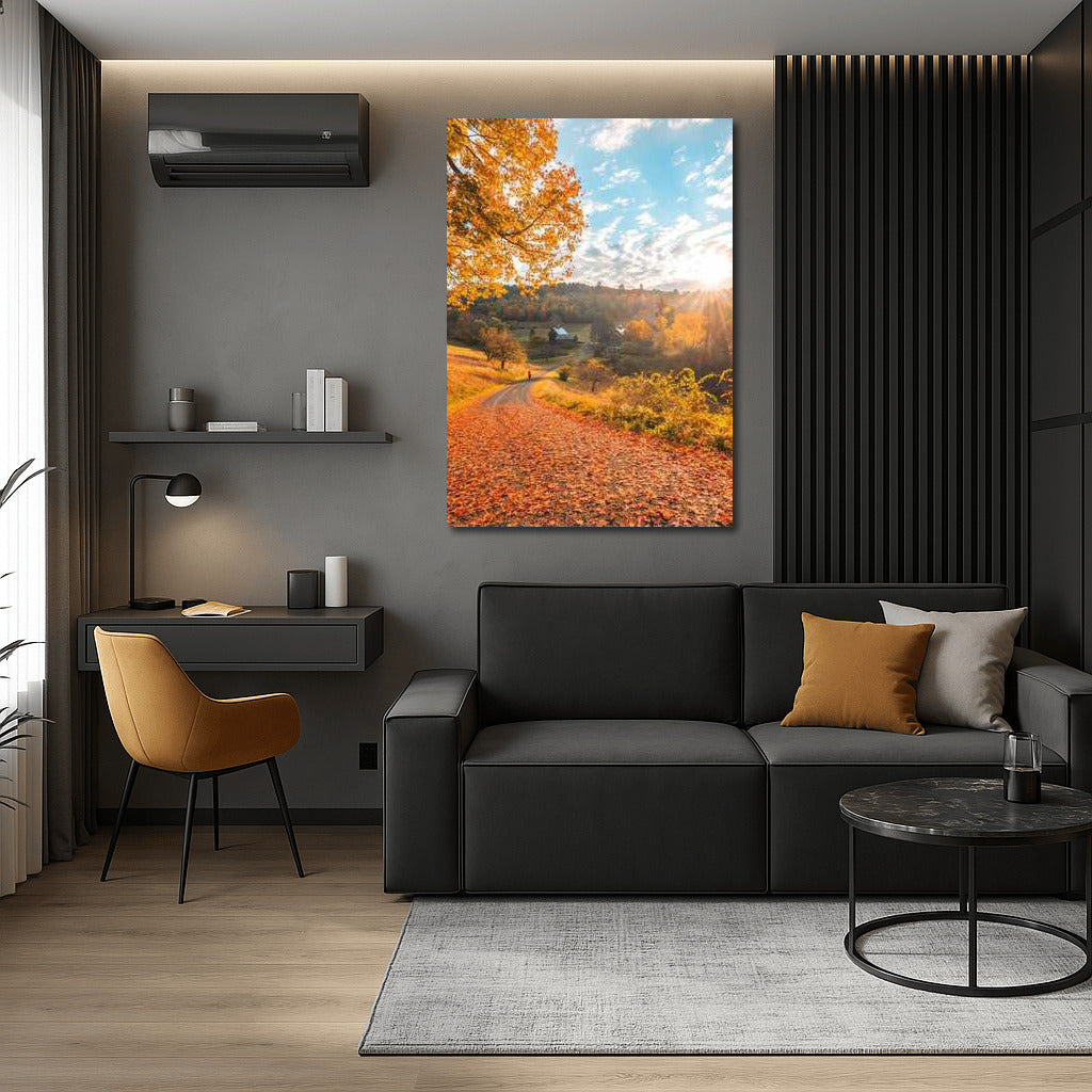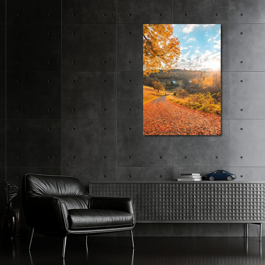 Immerse yourself in an autumn fairy tale: paintingsque wall art with golden landscapes of Vermont. The art of coziness in your home. See more from the collection: Country Art