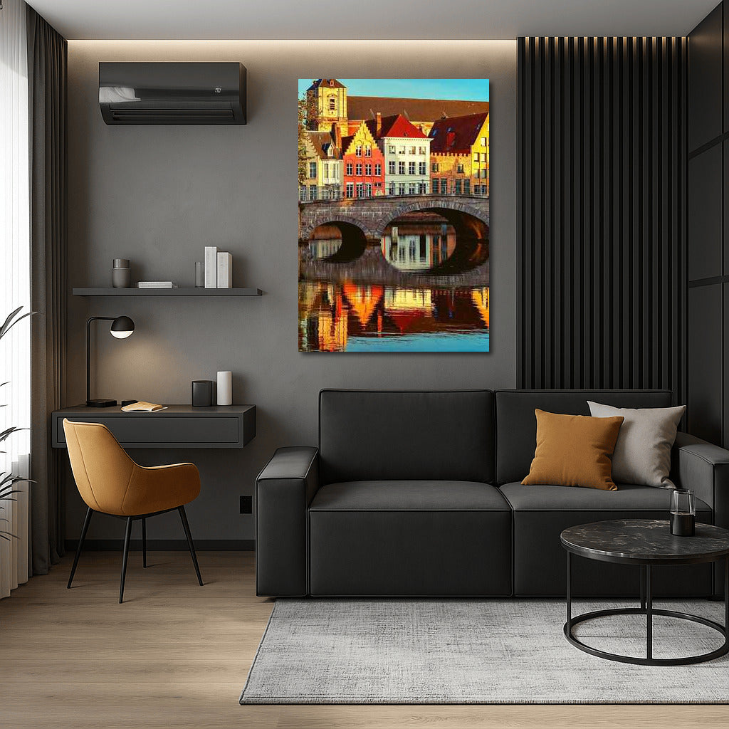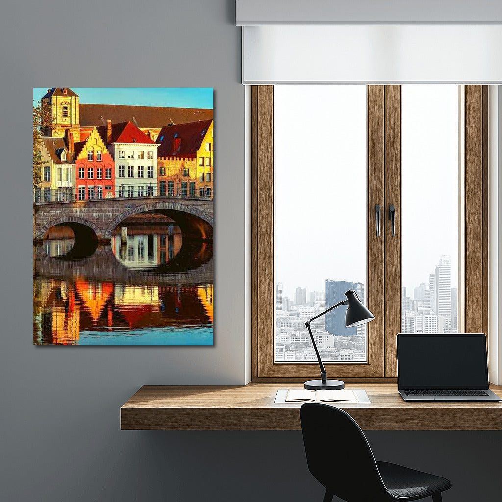 The colorful facades of Belgium are reflected in the water, creating an atmosphere of calm and charm. The perfect poster for the beauty of the home. See more from the collection: Belgium Art