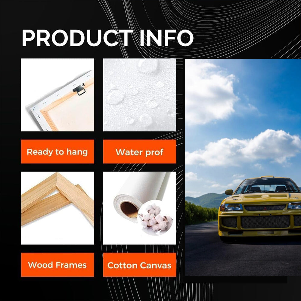 This poster is a blast! It features a yellow Lancer that looks like it just burst out of the jungle. This is not just a painting, it is wall art for those who understand the madness of car fans. Hang it on your wall and feel the roar of the engine in your room. See more from the collection: Mitsubishi Art