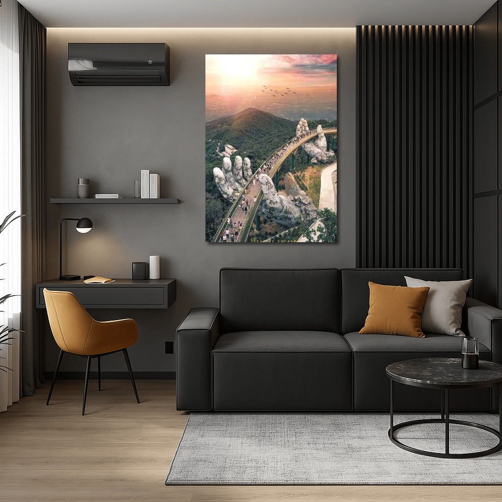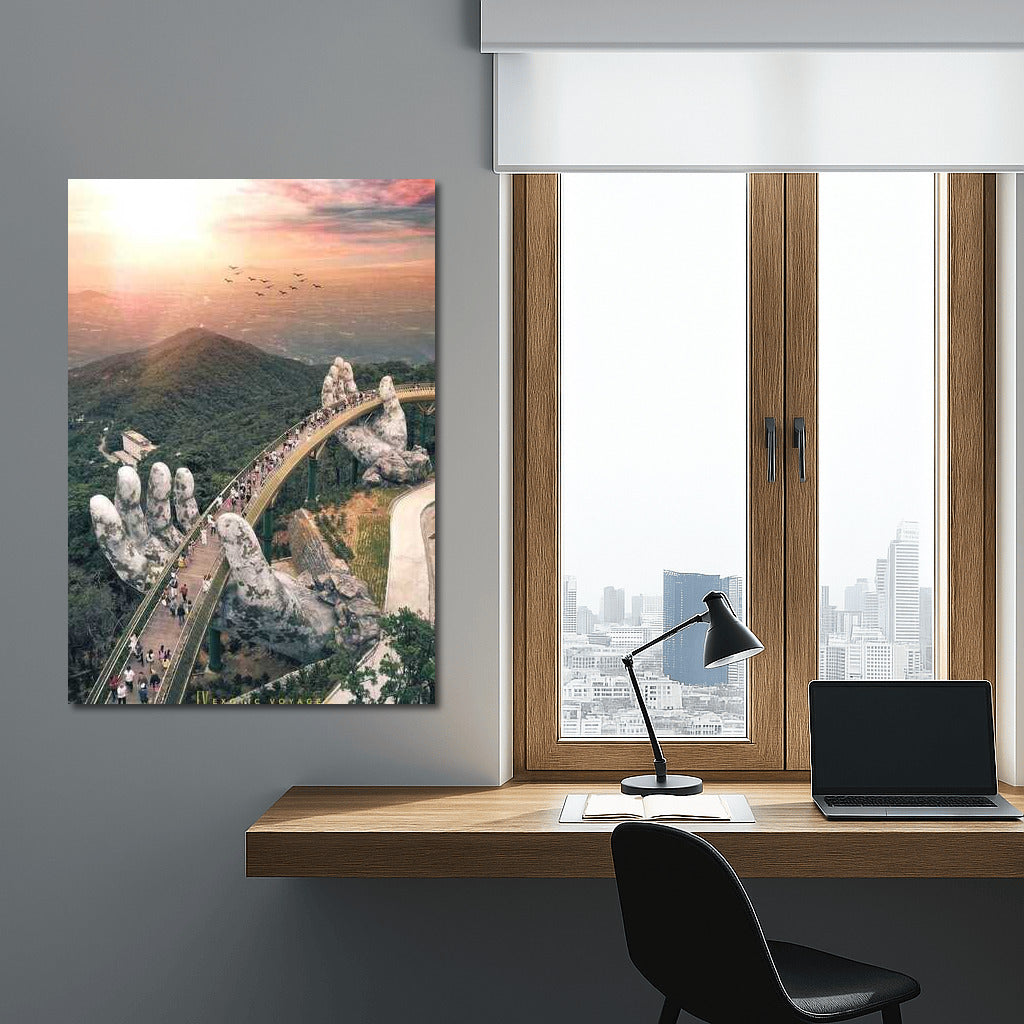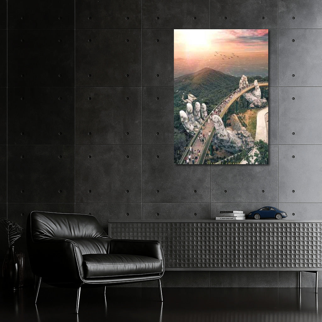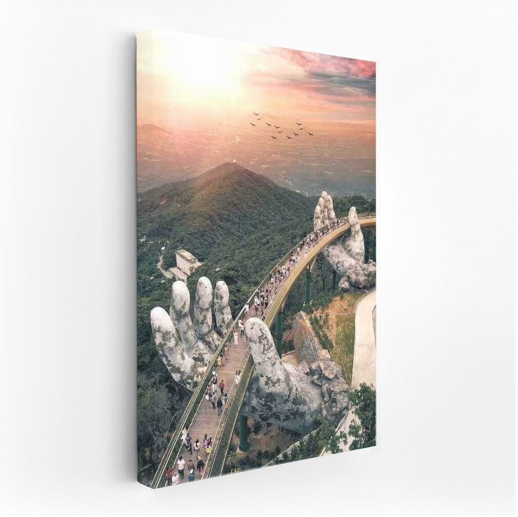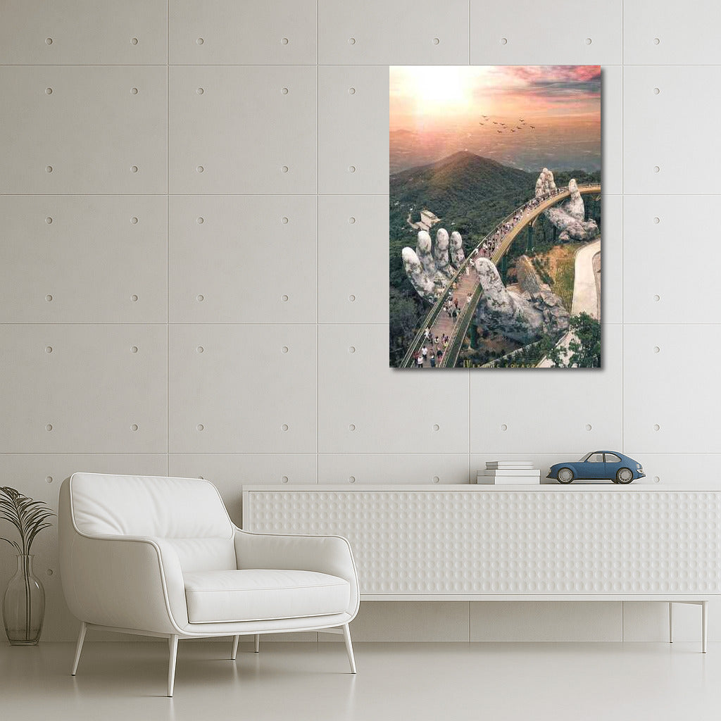A mesmerizing poster of a bridge resting in stone hands, connecting the heavens and earth of Vietnam. Nature wall art. See more from the collection: Country Art