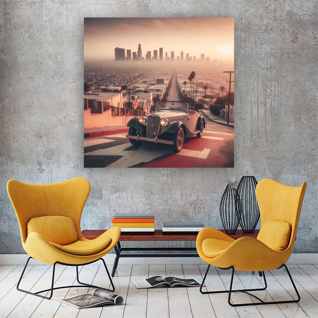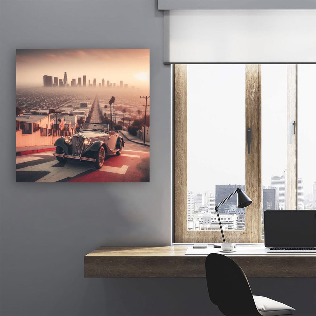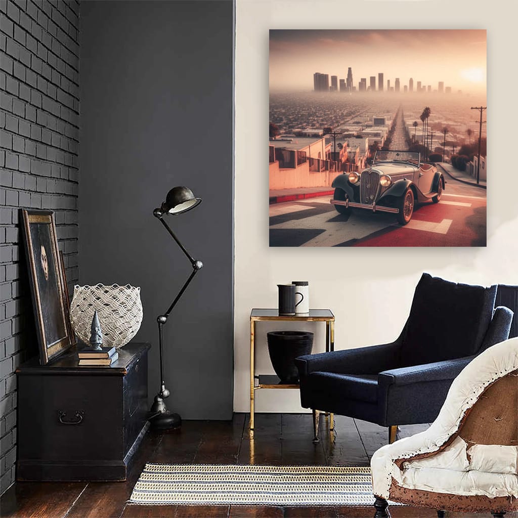 This wall art is just the bomb! An old retro Alfa Romeo on the streets of Los Angeles - what could be cooler? This poster is a dream of any car fan, a real must-have for the garage. Wall art for those who live for speed and style. See more from the collection: Alfa Romeo Art