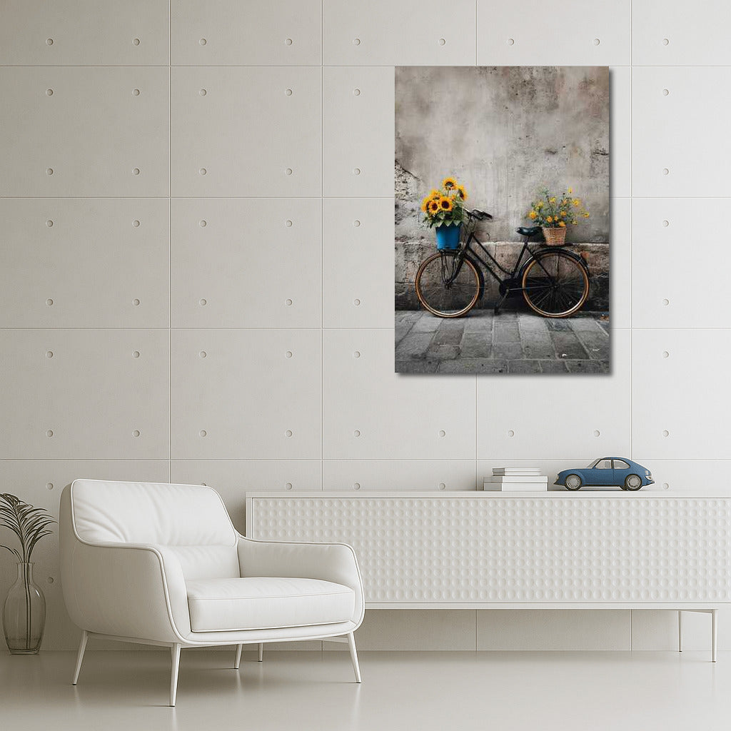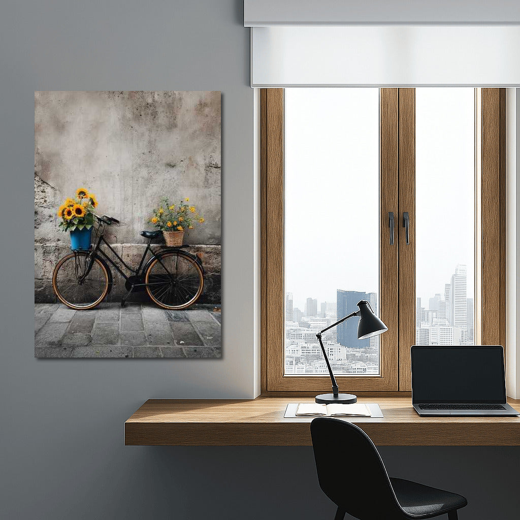 A vintage bicycle with baskets of colorful sunflowers brings a cozy and calm atmosphere to this captivating wall art. See more from the collection: Bicycle Art