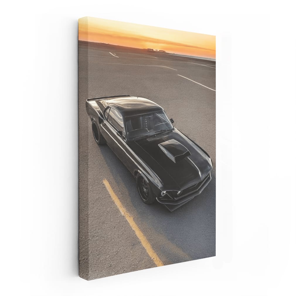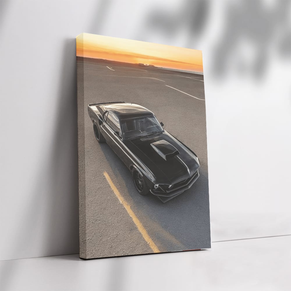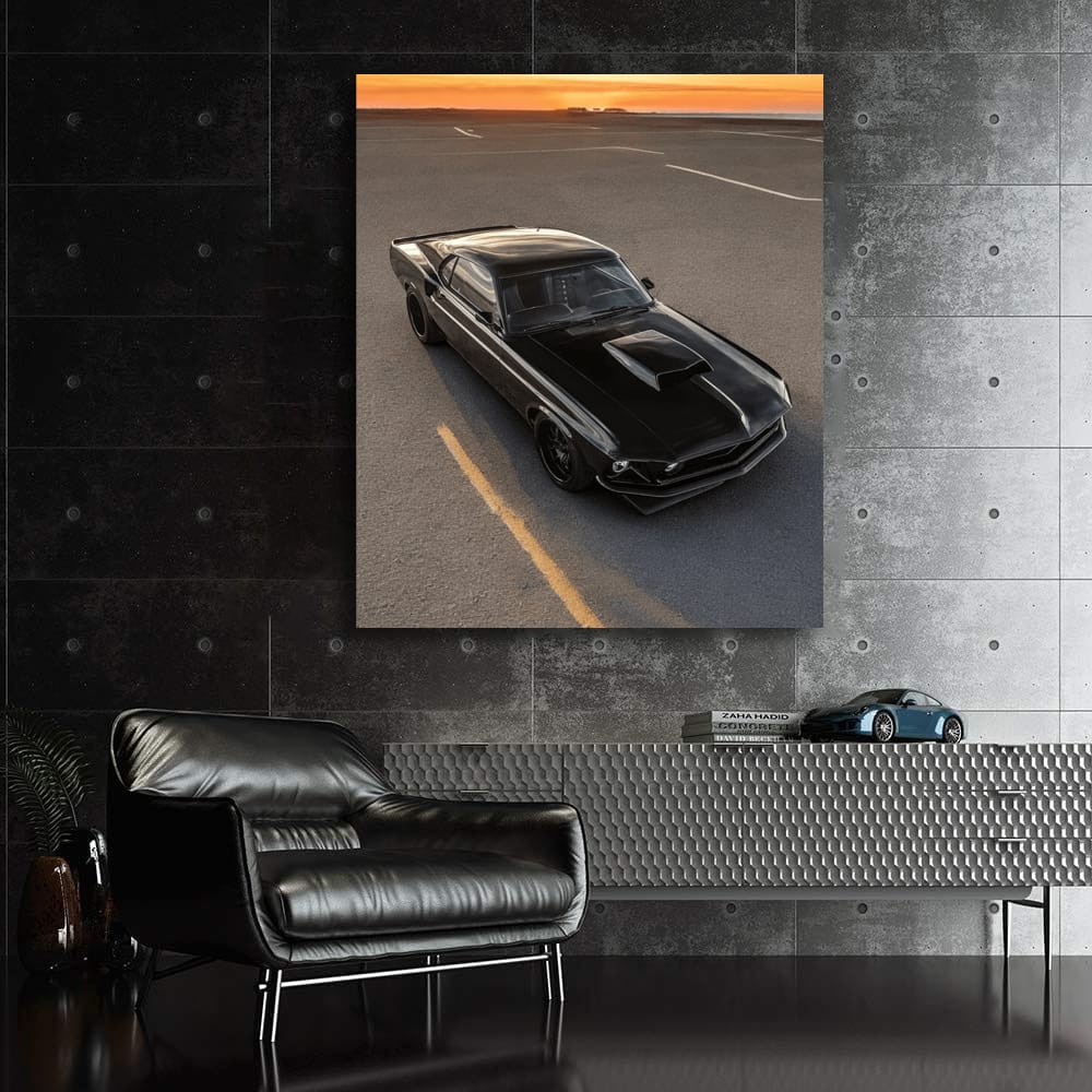 Vintage Black Mustang at Sunset - Classic Elegance Wall Art