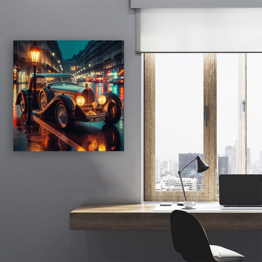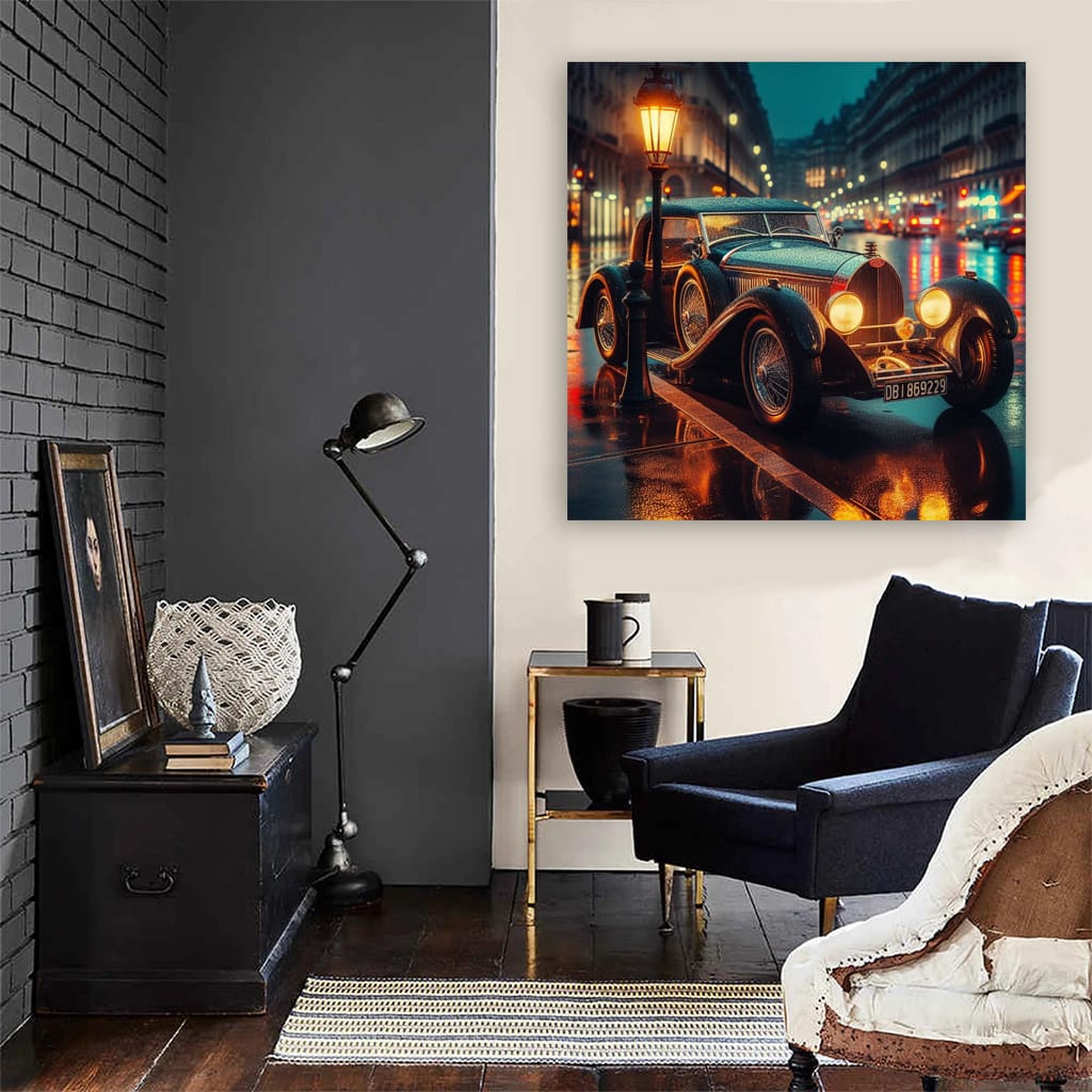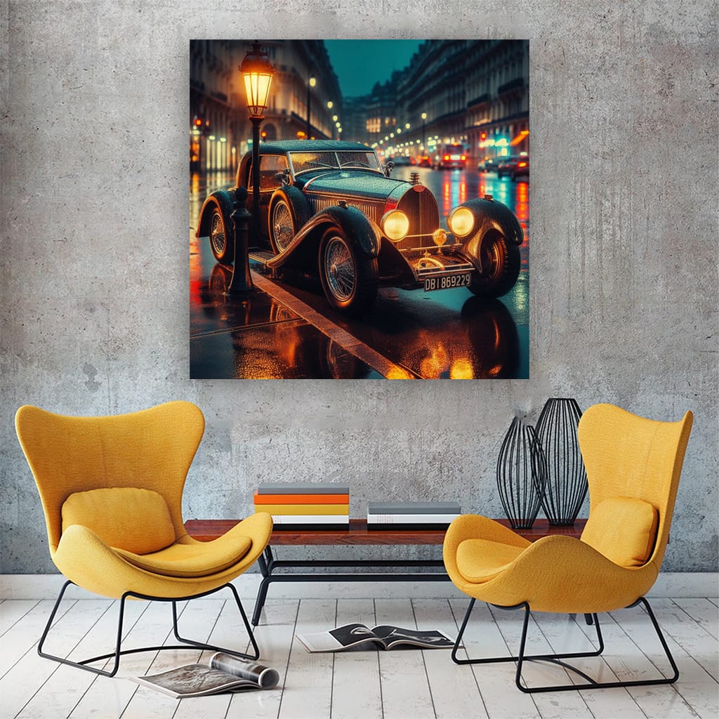 Hey bro, check out this poster - retro Bugatti, night and all. This wall art just breathes history! A cool painting for true car lovers that will add a bold touch to any room. Hang it up and feel the engine roar! See more from the collection: Bugatti Art