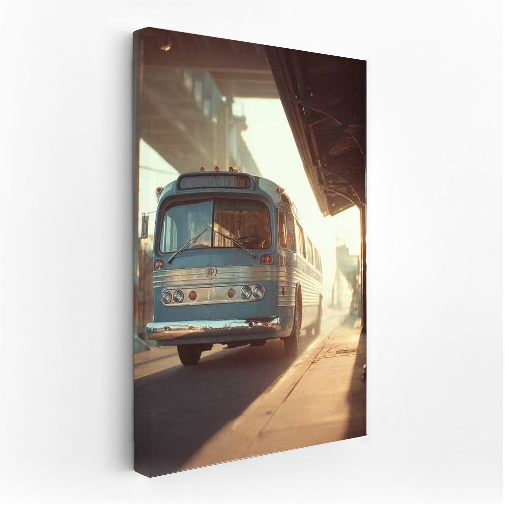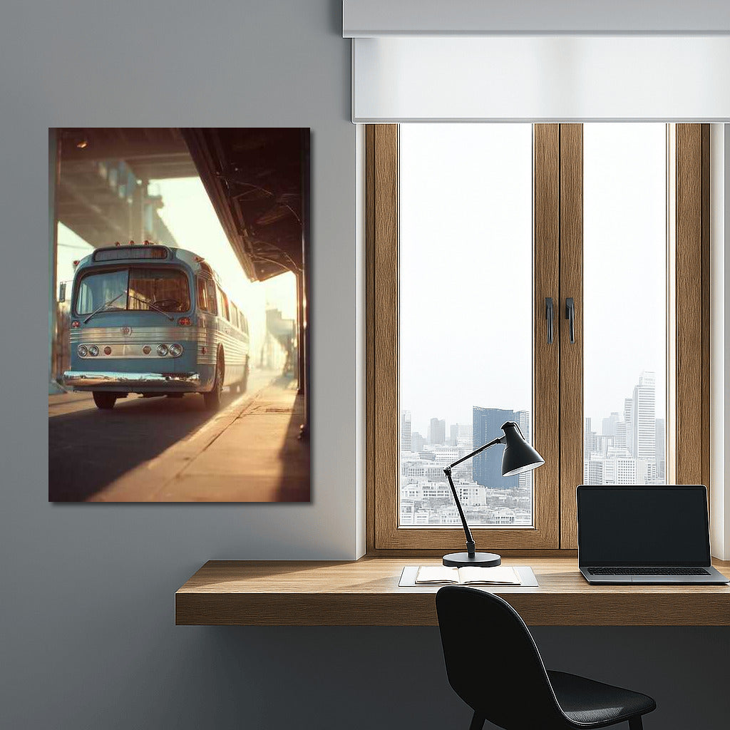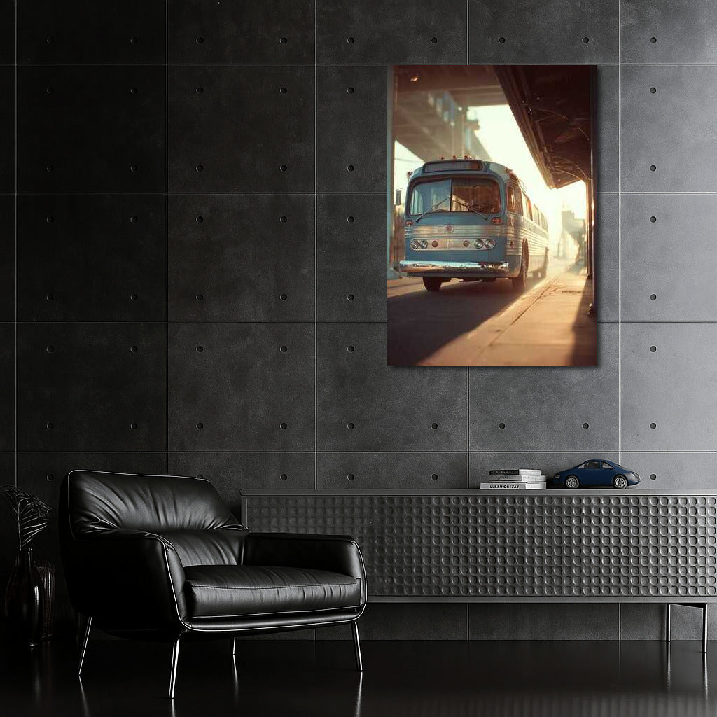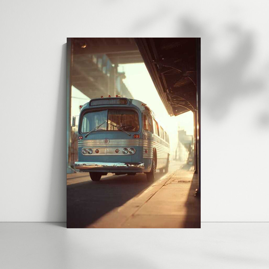 Vintage bus through sunset rays. This poster is a retro tribute to atmospheric transport art for your wall. See more from the collection: Buses Art