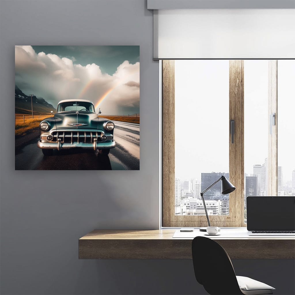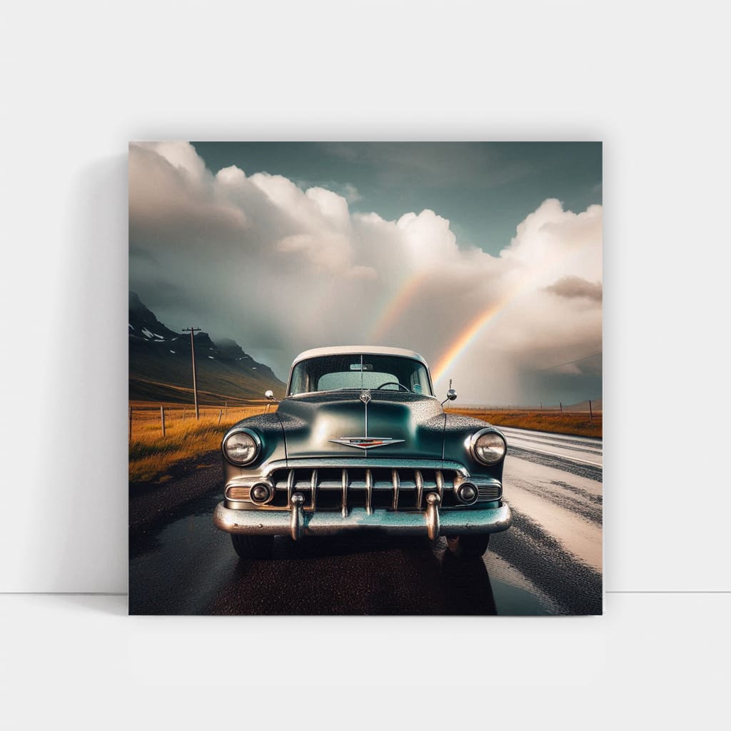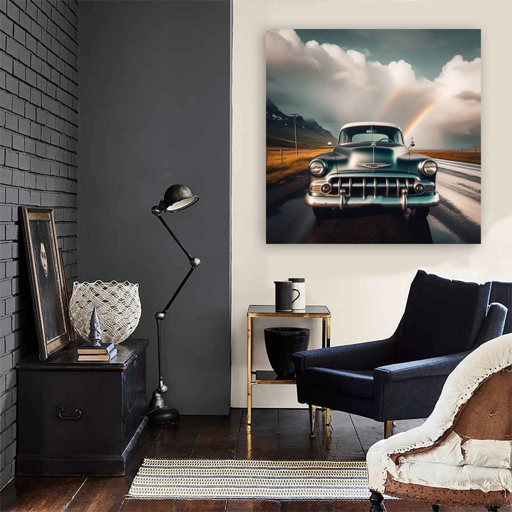 This poster is pure badass, bro! It features a good old Chevrolet in retro style, under a cloudy sky. Wall art for those who crave adrenaline and the spirit of adventure. Put it on your wall and you will immediately feel the roar of the engine and the wind in your hair. See more from the collection: Chevrolet Art