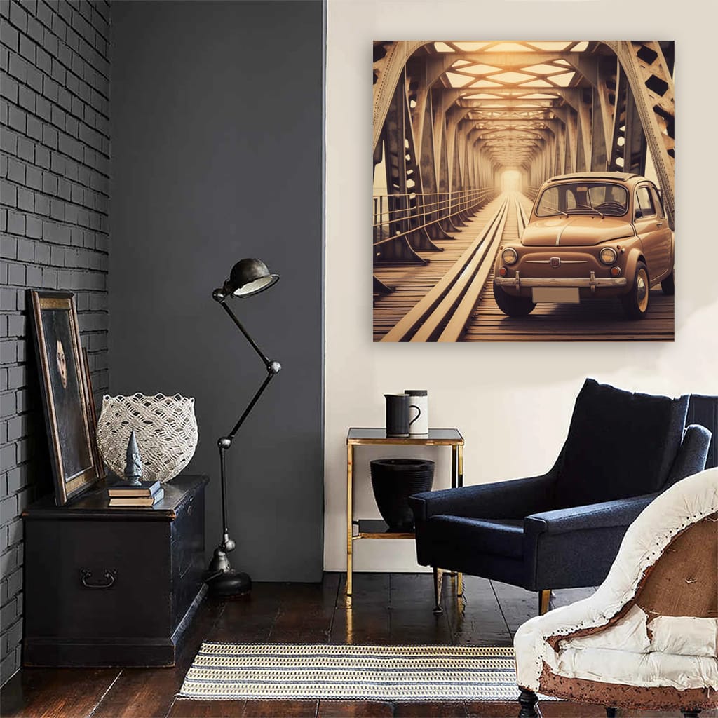 This wall art is pure joy for lovers of old school cars! A poster with a view of a retro bridge and a vintage Fiat - as if time stood still. Such a painting on the wall is the perfect companion for the garage of a true connoisseur of classics. See more from the collection: Fiat Art