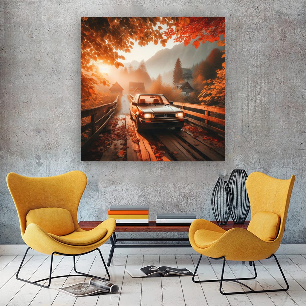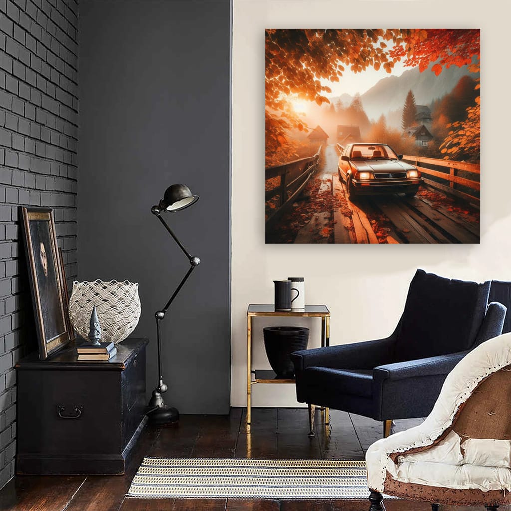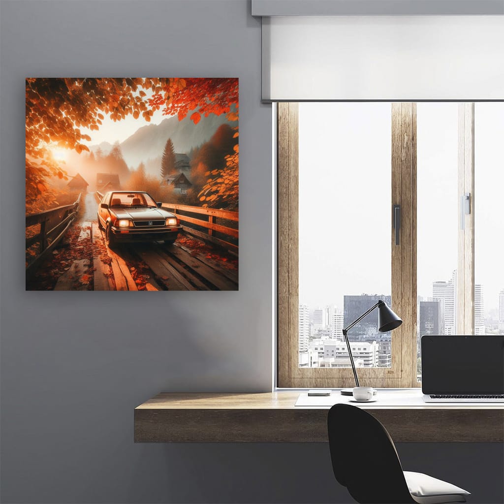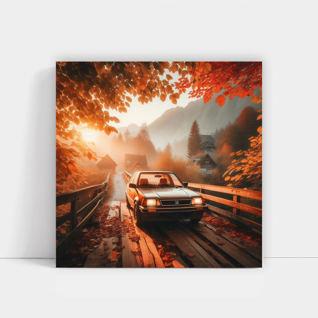 This poster is a real find for fans of old-school cars. The painting with a vintage Honda standing on an old bridge is wall art for true connoisseurs of retro. Look at it and feel the spirit of freedom and speed! See more from the collection: Honda Art