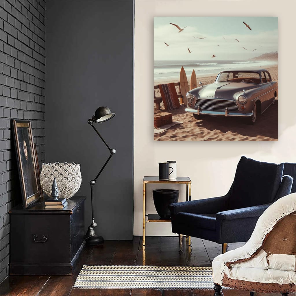 painting this: a poster of an Infiniti on the beach. This car is a retro beast, ready to conquer the waves. Wall art that will make your heart beat faster. A painting where good old style meets the sea breeze. Now that's what I call old school drive! See more from the collection: Infiniti Art