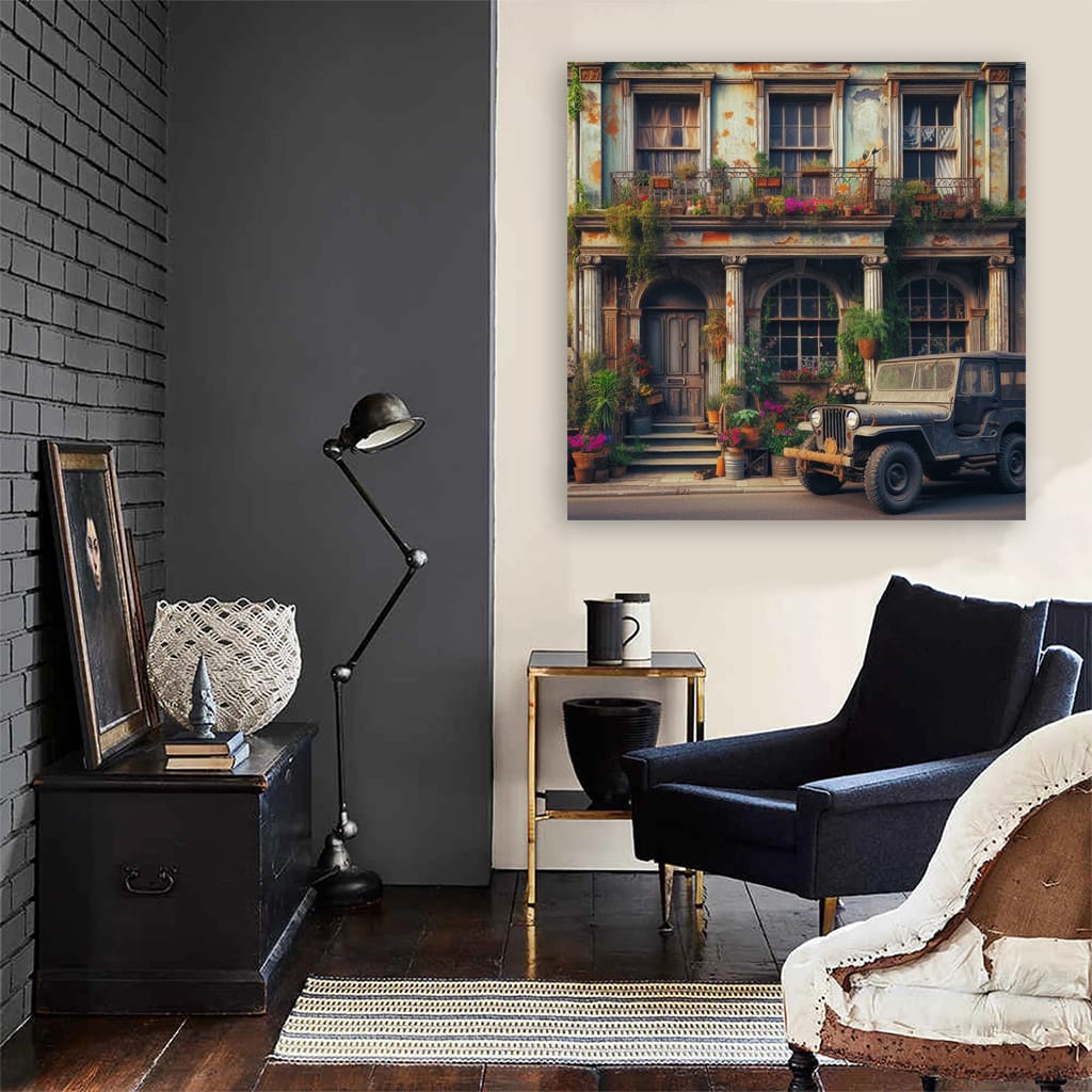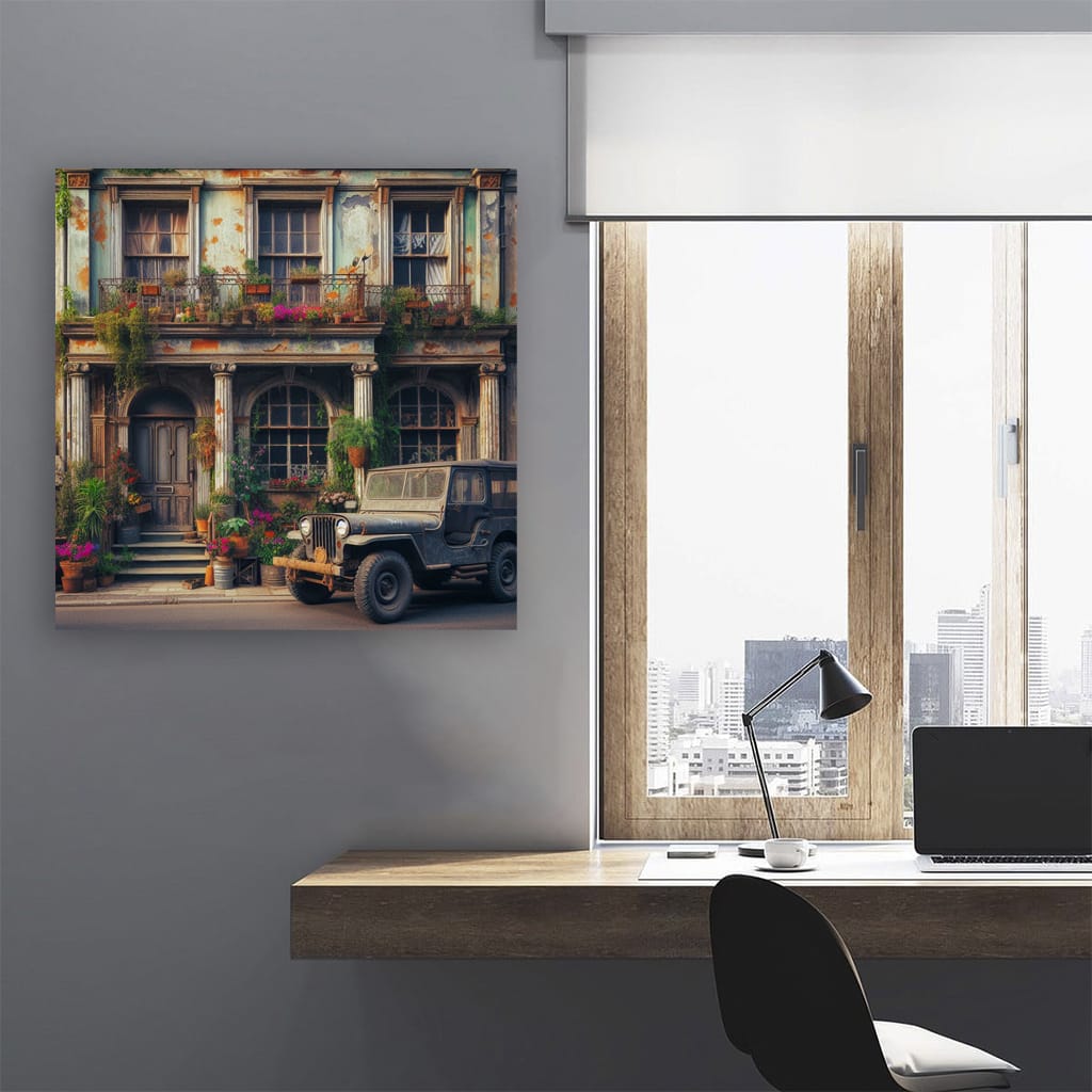 Vintage Jeep Near Classic Building - Timeless Adventure Wall Art