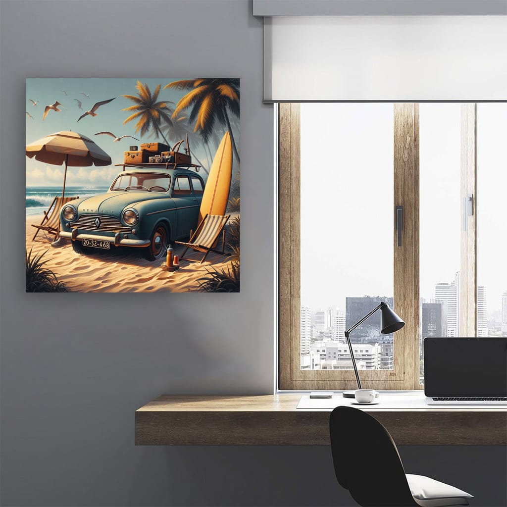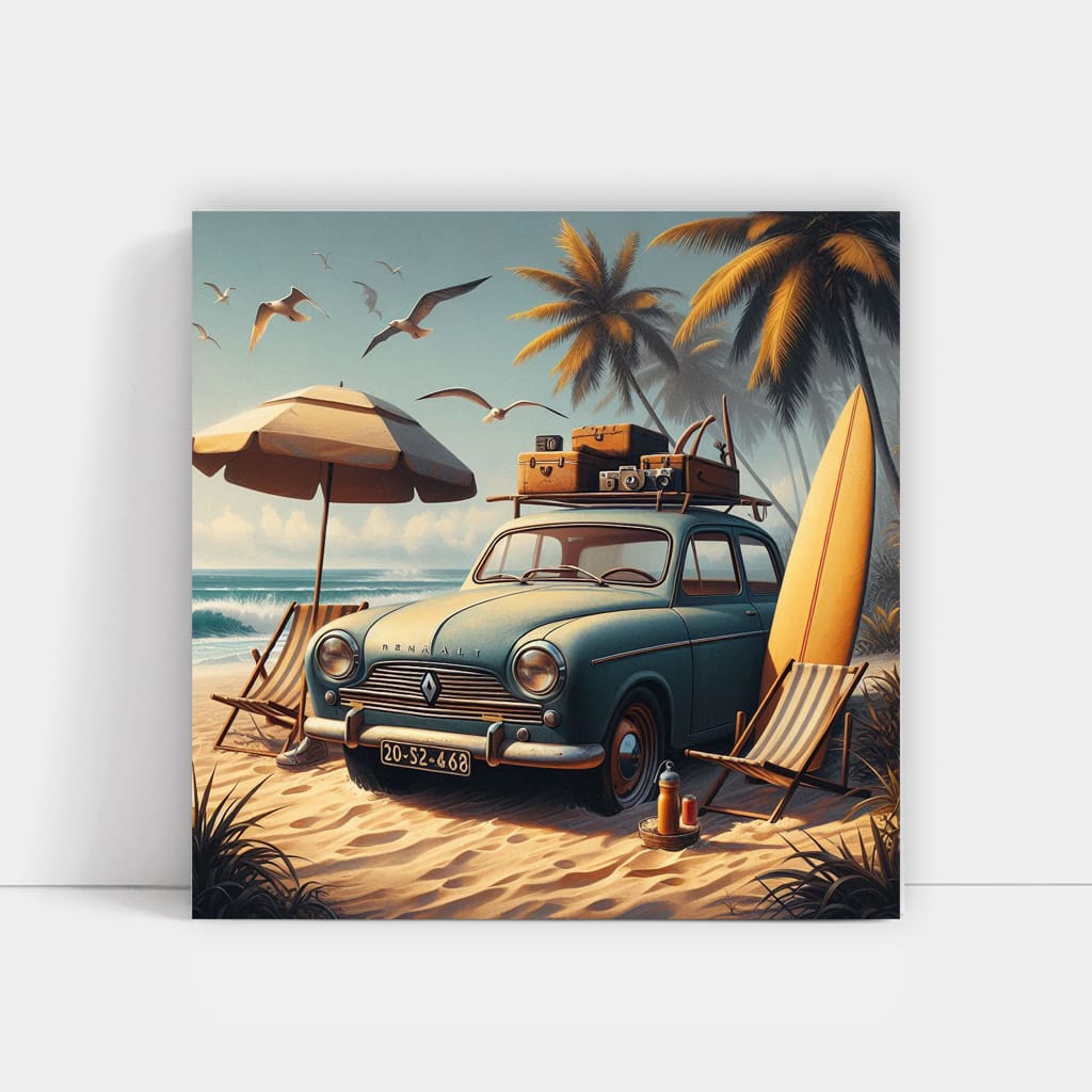 Yo, bros! Check out this poster - Renault on the beach, like from an old movie. This wall art is a real bomb for car lovers. The painting seems to be made for guys who love power and style. Such a thing on the wall is a sign of respect! See more from the collection: Renault Art