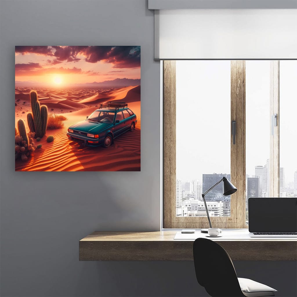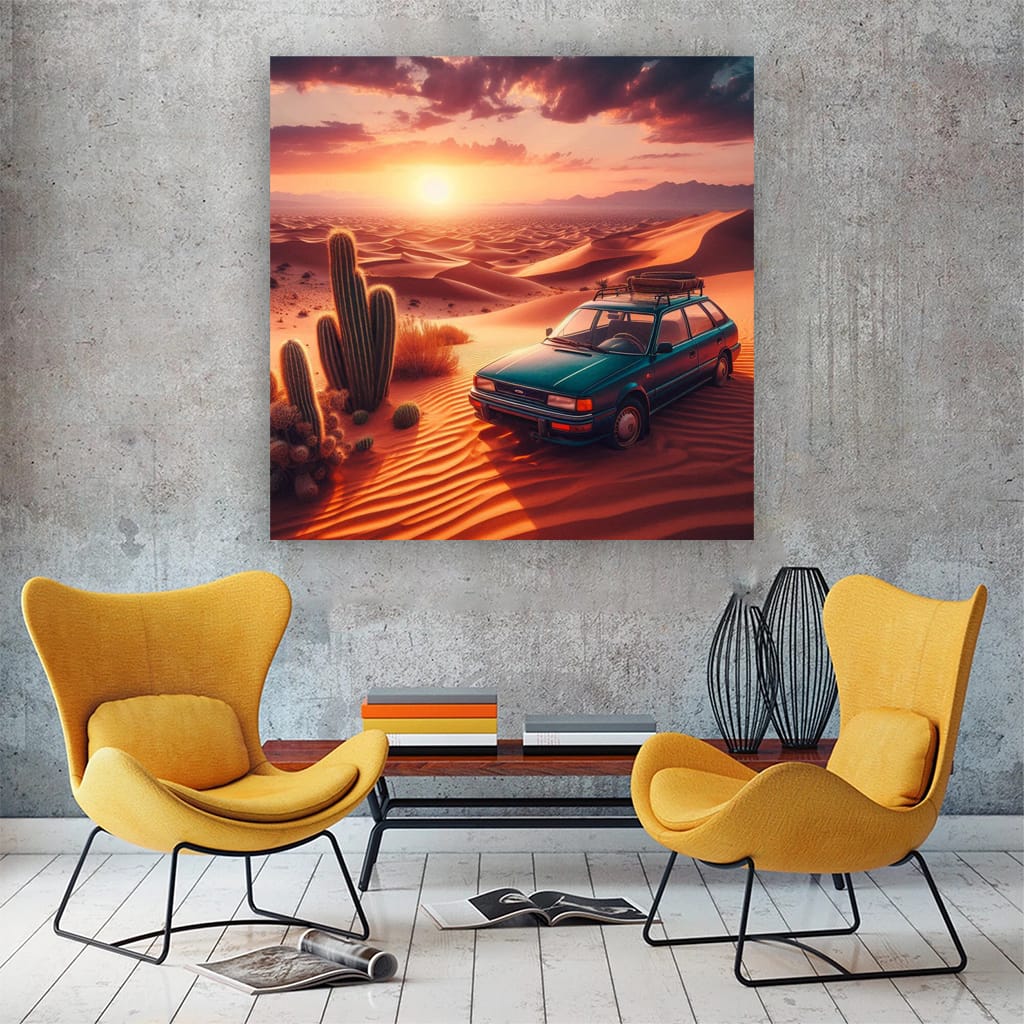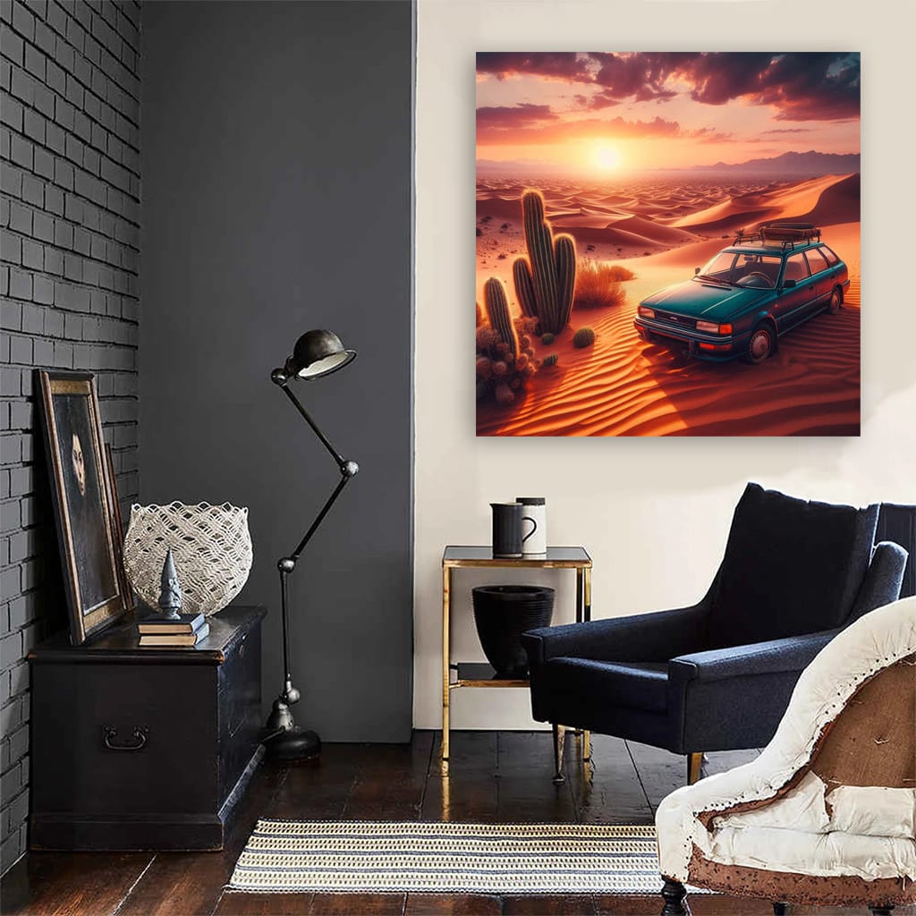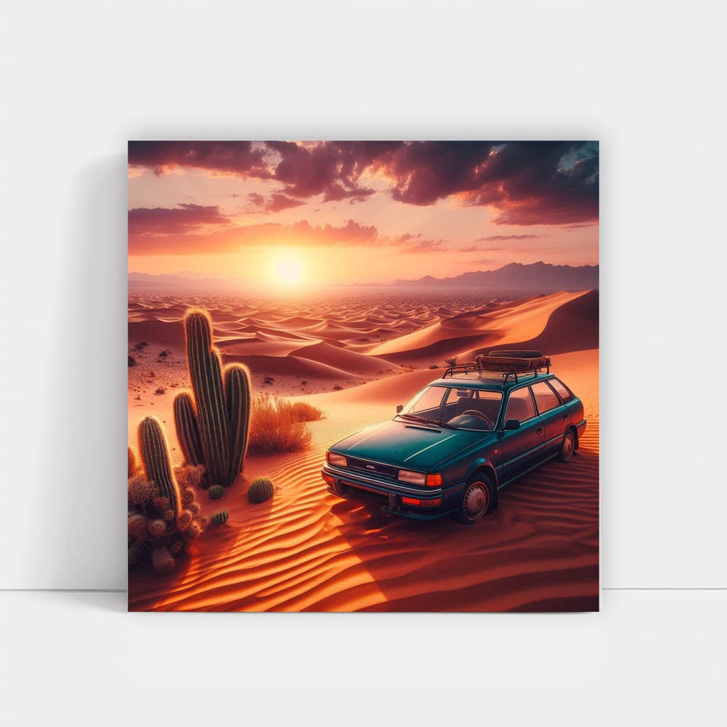 Dude, this poster is just the bomb. An old Subaru against the desert background is a real retro race in all its glory. Wall art for those who live for speed and desert freedom. Hang this painting, and your wall will speak the language of speed and adventure. See more from the collection: Subaru Art