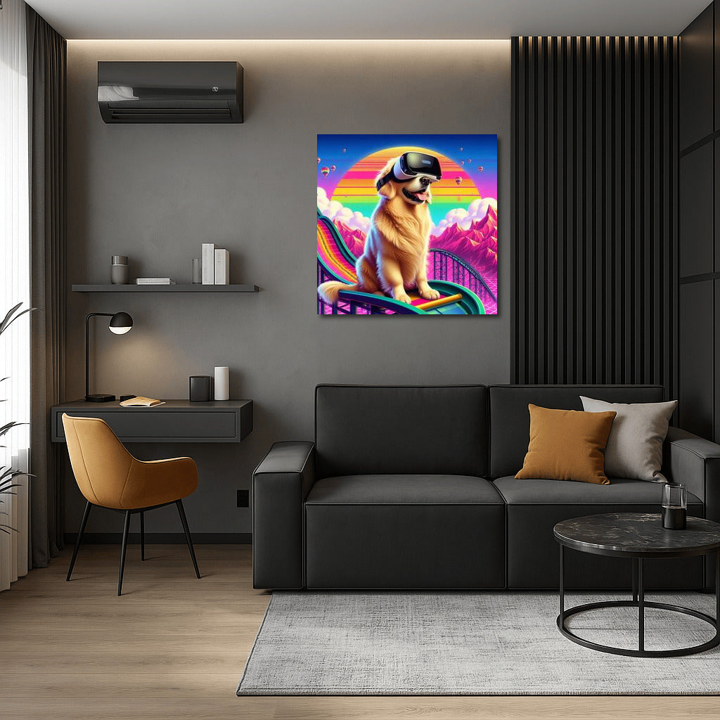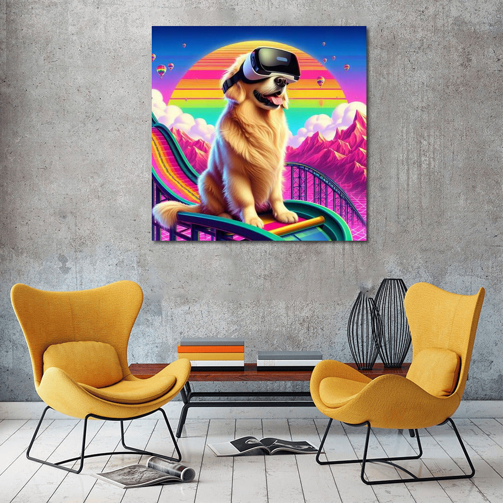 Dive into virtual reality: a poster with a dog on a roller among colorful mountains and balloons. Wall art of the future! See more from the collection: Animals Art